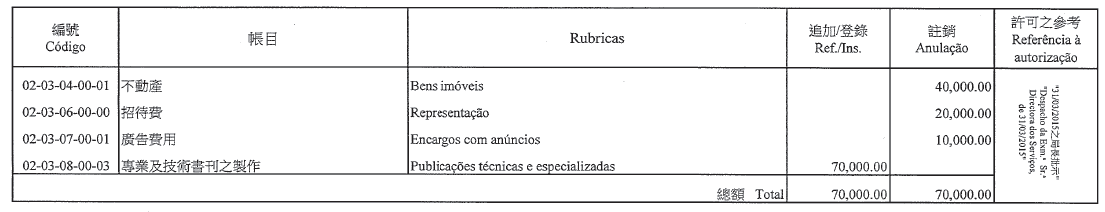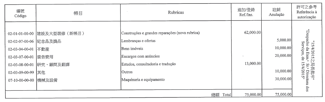 De acordo com o artigo 41.º do Regulamento Administrativo n.º 6/2006, versão republicada pelo Despacho do Chefe do Executivo n.º 426/2009, publica-se a 1.ª alteração ao orçamento privativo do Instituto de Formação Turística para o ano económico de 2015, autorizada por despacho do Ex.mo Senhor Secretário para os Assuntos Sociais e Cultura, de 13 de Maio do mesmo ano: