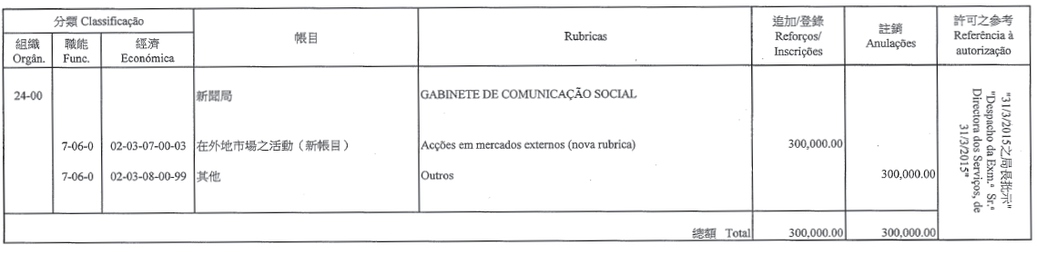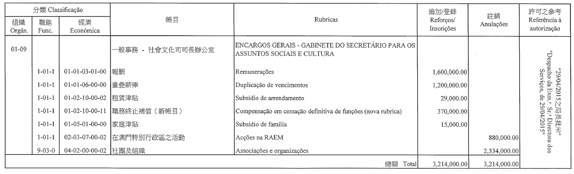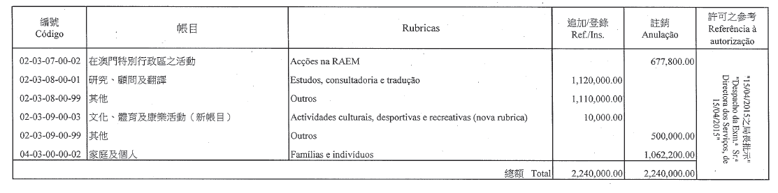 — De acordo com o disposto no n.º 2 do artigo 9.º da Lei n.º 9/2014, publicada no Boletim Oficial da Região Administrativa Especial de Macau n.º 52, I Série (2.º Suplemento), de 31 de Dezembro, publicam-se as seguintes alterações à distribuição da verba global do capítulo 01-02 com as classificações funcional 1-01-3 e económica 04-01-05-00-68 da tabela de despesa corrente do Orçamento da Região Administrativa Especial de Macau para o corrente ano económico, sob a designação: «Transferências Correntes — Sector Público — Outras — Comissão de Desenvolvimento de Talentos», autorizadas nos termos do n.º 2 do Despacho do Chefe do Executivo n.º 347/2006: