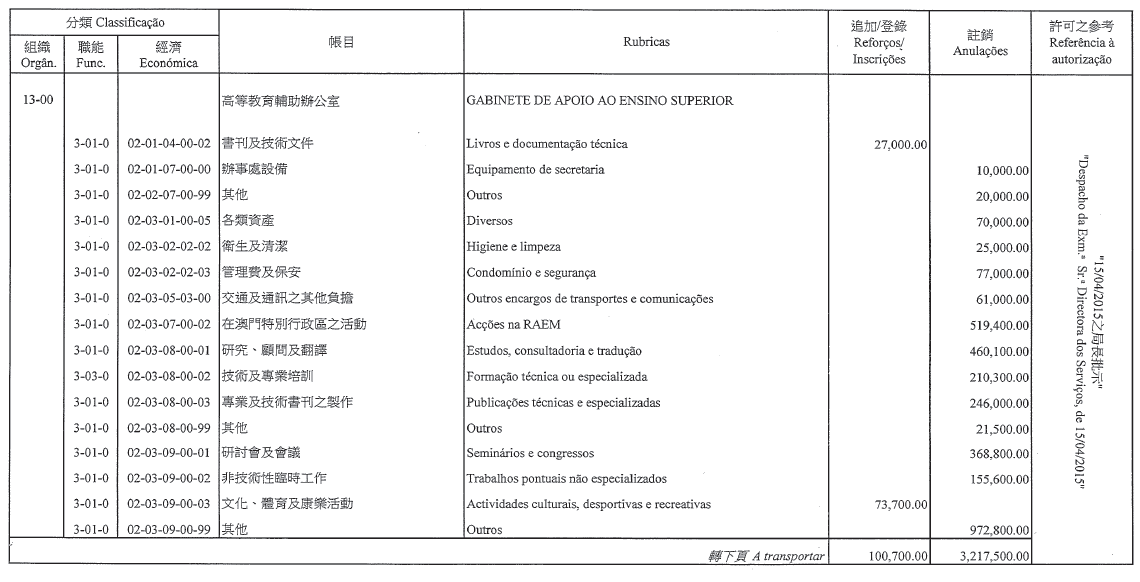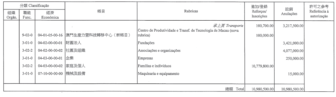 — De acordo com o disposto no n.º 2 do artigo 9.º da Lei n.º 9/2014, publicada no Boletim Oficial da Região Administrativa Especial de Macau n.º 52, I Série (2.º Suplemento), de 31 de Dezembro, publicam-se as seguintes alterações à distribuição da verba global do capítulo 01-10 com as classificações funcional 8-01-0 e económica 04-01-05-00-03 da tabela de despesa corrente do Orçamento da Região Administrativa Especial de Macau para o corrente ano económico, sob a designação: «Transferências Correntes — Sector Público — Outras — Conselho de Ciência e Tecnologia», autorizadas nos termos do n.º 2 do Despacho do Chefe do Executivo n.º 347/2006: