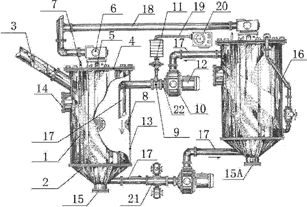 [57] Resumo : 本發明公開一種餐厨垃圾聯合篩選系統,該篩選系統包括殼體,殼體內設有分隔板,通過分隔板將殼體內部分為氣浮區和非氣浮區,分隔板上設有物料漏出口,氣浮區處設有進料口,氣浮區下部設有重物料卸出口,重物料卸出口處設有閥門,重物料卸出口四周設有一個以上的空氣噴嘴,氣浮區上部設有滾耙,非氣浮區內設有物料輸出器,物料輸出器一端設置在殼體內,另一端設置在殼體外側,物料輸出器內設有攪龍,物料輸出器上安裝有卸料電機,卸料電機帶動攪龍轉動。本發明可利用氣浮和滾耙,將餐厨垃圾中的塑料、牙籤等去除,在利用沉積工藝將餐厨垃圾中的玻璃、金屬等重物去除,最後將有用物料輸出進行進一步加工,實現餐厨垃圾自動篩選。