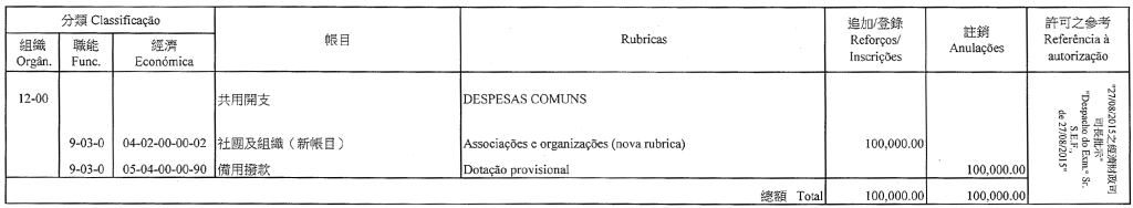 Nos termos dos artigos 41.º, n.º 3, e 43.º do Regulamento Administrativo n.º 6/2006, na redacção do Regulamento Administrativo n.º 28/2009, publica-se a 1.ª alteração ao orçamento privativo do Gabinete do Procurador para o ano económico de 2015, aprovada por despacho do Ex.mo Senhor Procurador, de 8 de Setembro do mesmo ano: