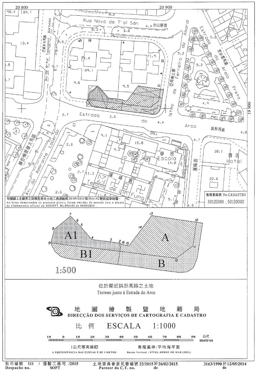 1. 為統一兩幅登記面積分別為400.90(肆佰點玖)平方米及220.47(貳佰貳拾點肆柒)平方米,經重新量度後修正為421(肆佰貳拾壹)及225(貳佰貳拾伍)平方米,位於澳門半島,鄰近拱形馬路,標示於物業登記局B33冊第174頁第12554號及B30冊第156頁背頁第11394號,在地圖繪製暨地籍局於二零一四年五月十二日發出的第3163/1990號地籍圖中以字母“A”、“B”、“A1”及“B1”定界及標示,面積分別為259(貳佰伍拾玖)平方米、162(壹佰陸拾貳)平方米、123(壹佰貳拾叁)平方米及102(壹佰零貳)平方米的土地的法律制度,本合同的標的為: