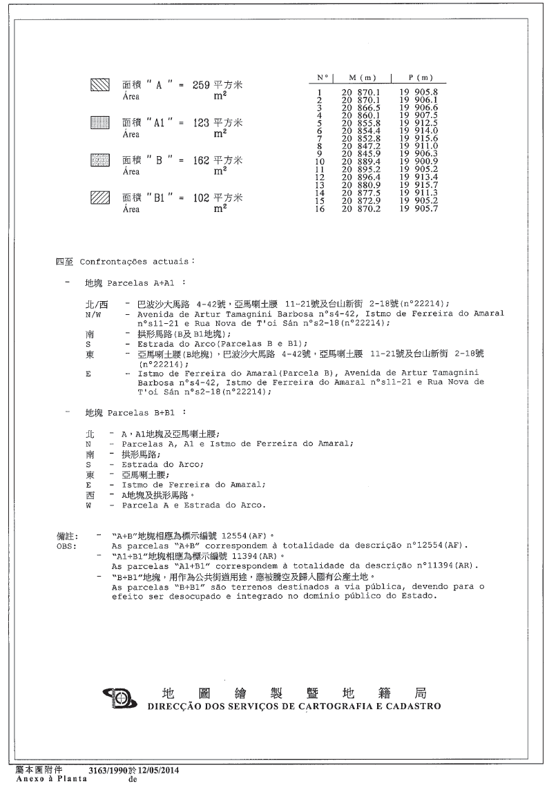 五、上述土地在地圖繪製暨地籍局於二零一四年五月十二日發出的第3163/1990號地籍圖中以字母“A”、“B”、“A1”及“B1”定界和標示,面積分別為259平方米、162平方米、123平方米及102平方米。
