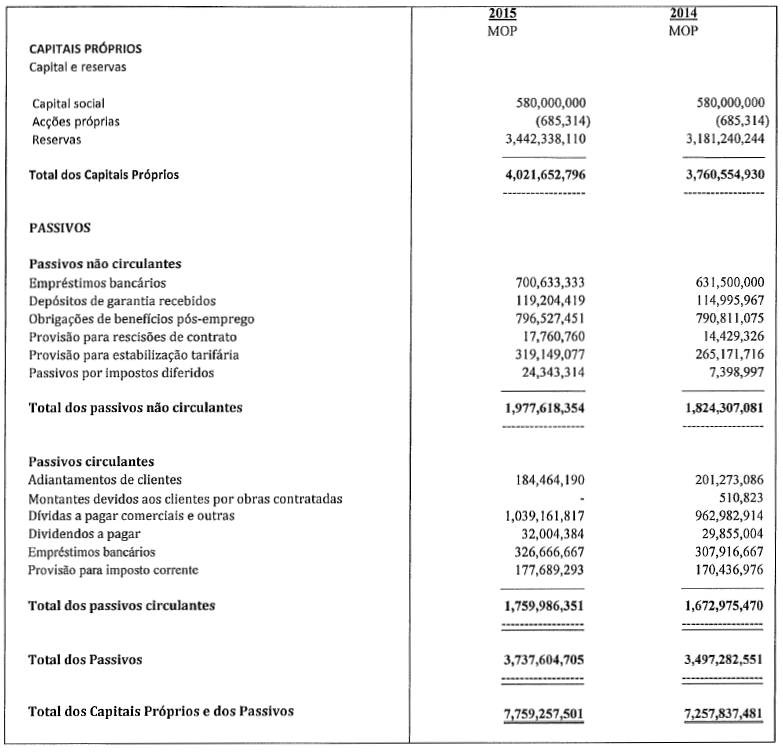 Procedemos à auditoria das demonstrações financeiras da Companhia de Electricidade de Macau - CEM, S.A. relativas ao ano de 2015, nos termos das Normas de Auditoria e Normas Técnicas de Auditoria da Região Administrativa Especial de Macau. No nosso relatório, datado de 11 de Março de 2016, expressámos uma opinião sem reservas relativamente às demonstrações financeiras.