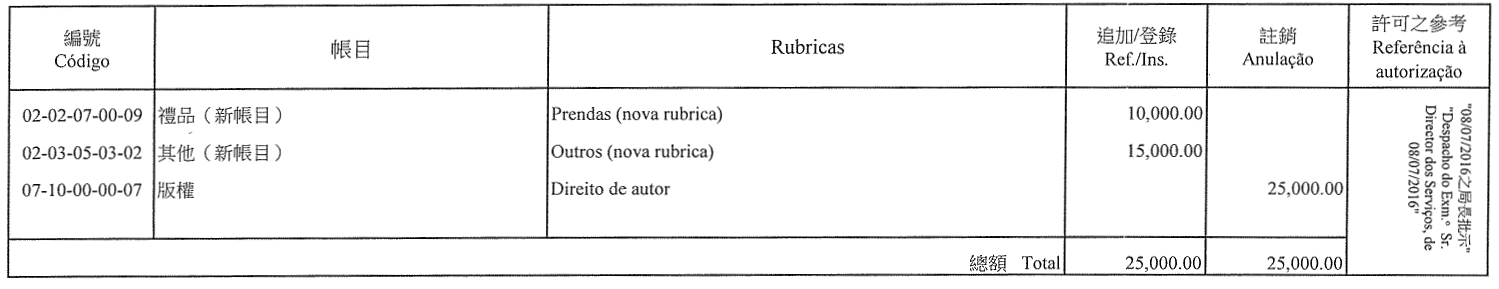 | 02 | 03 | 07 | 00 | 02 | Acções na RAEM | 600,000.00 | |