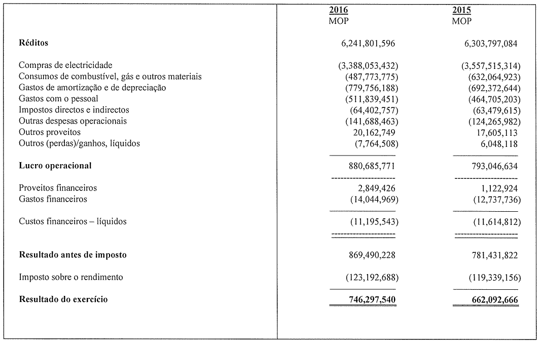 Em 2016, o consumo de energia aumentou 5,8% em comparação com o ano anterior e atingiu um novo recorde máximo de 5255 GWh, sendo que o pico da procura aumentou 5,6% para 932 MW. A CEM tem-se comprometido desde sempre em prestar a Macau um serviço de fornecimento de energia de nível mundial e em apoiar o desenvolvimento sustentável da economia local. A CEM teve um bom desempenho operacional em 2016, tendo todos os Indicadores-chave de Desempenho excedido os objectivos traçados no contrato de concessão. O lucro líquido foi de 746 milhões de patacas.