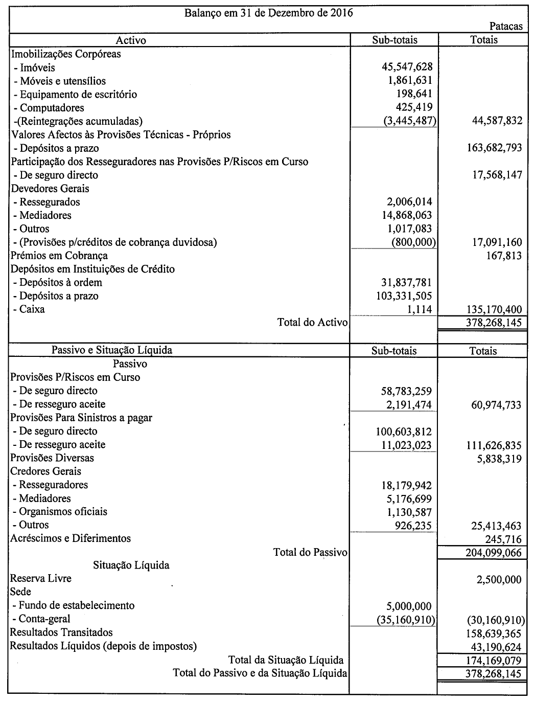 Procedemos à auditoria das demonstrações financeiras da Asia Insurance Company, Limited, Sucursal de Macau relativas ao ano de 2016, nos termos das Normas de Auditoria e Normas Técnicas de Auditoria da Região Administrativa Especial de Macau. No nosso relatório, datado de 10 de Abril de 2017, expressámos uma opinião sem reservas relativamente às demonstrações financeiras das quais as presentes constituem um resumo.
