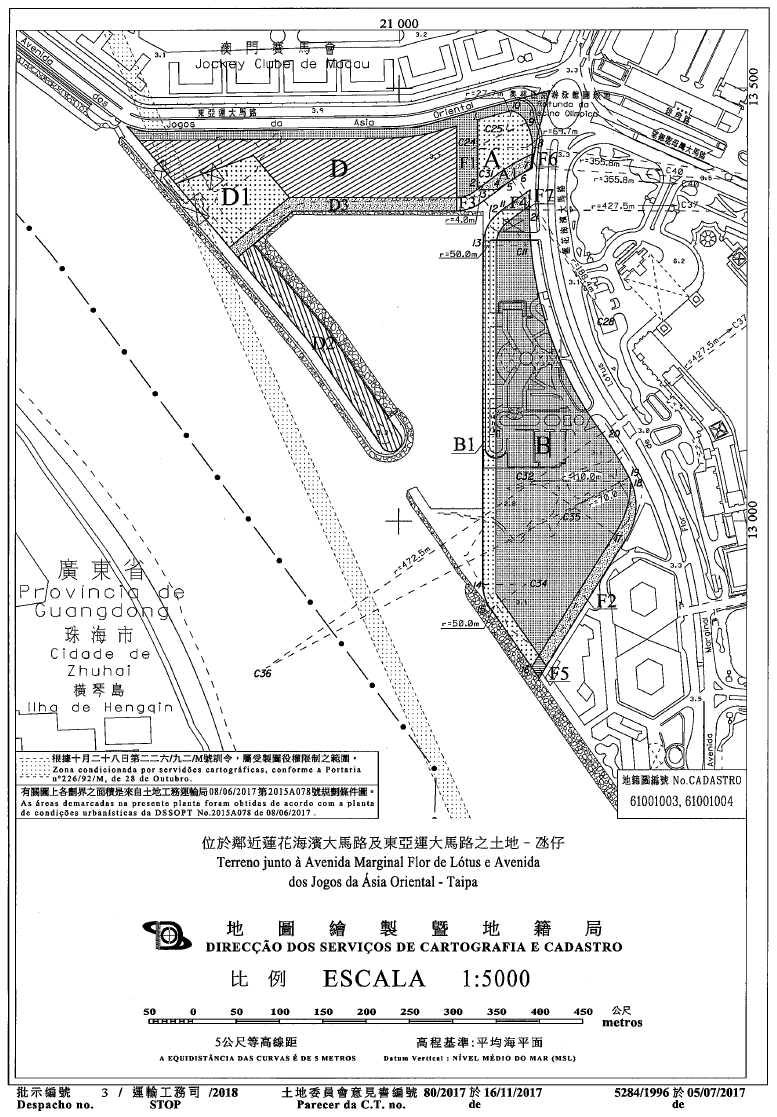 為修改一幅以租賃制度批出,登記面積為107,537(拾萬零柒仟伍佰叁拾柒)平方米,經重新量度後修正為107,573(拾萬零柒仟伍佰柒拾叁)平方米,位於氹仔島,鄰近蓮花海濱大馬路及東亞運大馬路,標示於物業登記局第22792號,及其批給的權利以乙方名義登錄於第F40K冊第185頁第11530號,在地圖繪製暨地籍局於二零一七年七月五日發出的第5284/1996號地籍圖中以字母“A”、“A1”、“B”、“B1”、“D”、“D1”、“D2”、“D3”、“F1”、“F2”、“F3”、“F4”、“F5”、“F6”及“F7”定界及標示的地塊所組成的土地的批給合同,本合同標的為: