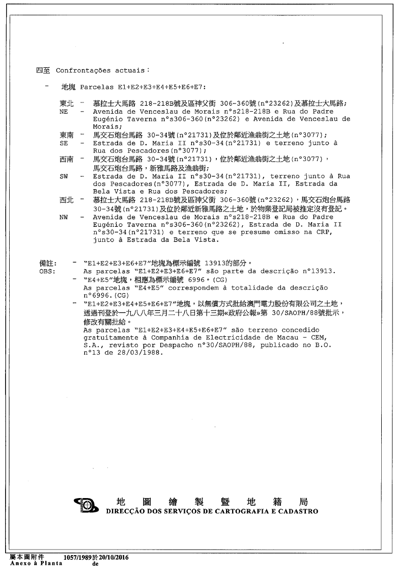 上述地塊在地圖繪製暨地籍局於二零一六年十月二十日發出的第1057/1989號地籍圖中以字母“E1”、“E2”、“E3”、“E4”、“E5”、“E6”及“E7”定界及標示,面積分別為7,324平方米、1,605平方米、1,343平方米、4,047平方米、165平方米、84平方米和69平方米。