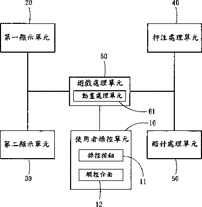 [57] Resumo : 本發明為一種玩家操控型百家樂系統,供一玩家進行一百家樂遊戲,其包含一使用者操控單元、一第一顯示單元、一第二顯示單元、一押注處理單元、一賠付處理單元與一遊戲處理單元,其中該玩家為透過該使用者操控單元產生複數操控訊號以控制該遊戲處理單元的動作,而進行該百家樂遊戲,並該遊戲處理單元的一動畫處理單元依據該些操控訊號產生對應的一荷官行為影像與一押注桌面影像,並讓該荷官行為影像與該押注桌面影像隨著不同的該些操控訊號具有不同的變化,且藉由該第一顯示單元與該第二顯示單元進行顯示,據此可讓玩家隨心所欲的操控百家樂的遊戲進度與遊玩方式,享受VIP的待遇,藉以增加遊玩的興趣。