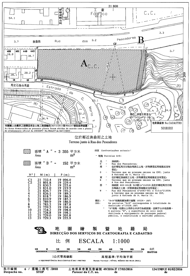 2)根據乙方提交並經甲方核准的計劃,按照二零一三年十一月二十六日核准的第90A257號街道準線圖的規定,在上項所述的地籍圖中以字母“B”定界及標示,面積152(壹佰伍拾貳)平方米的地塊上,興建連接漁翁街與瑪利二世皇后眺望台的公共步行系統,包括設置一台升降機;