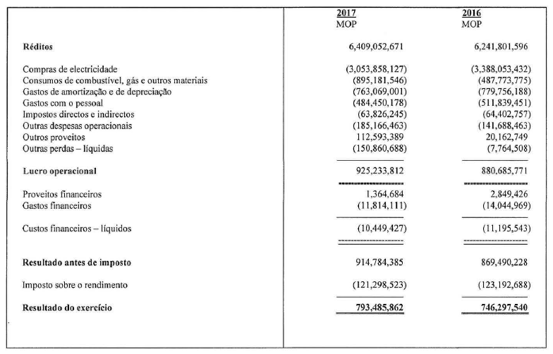 Em 2017, o consumo total de energia eléctrica de Macau atingiu 5.377 GWh, um aumento de 2,3% em relação ao ano anterior, com o pico de procura a crescer 7,7% para 1.004 MW. Todos os Indicadores de Desempenho da CEM excederam os objectivos traçados no contrato de concessão. O lucro líquido foi de 793 milhões de Patacas.