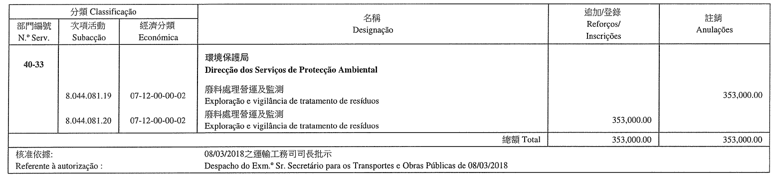 Direcção dos Serviços de Protecção Ambiental, aos 11 de Maio de 2018. — A Directora, substituta, Vong Man Hung.