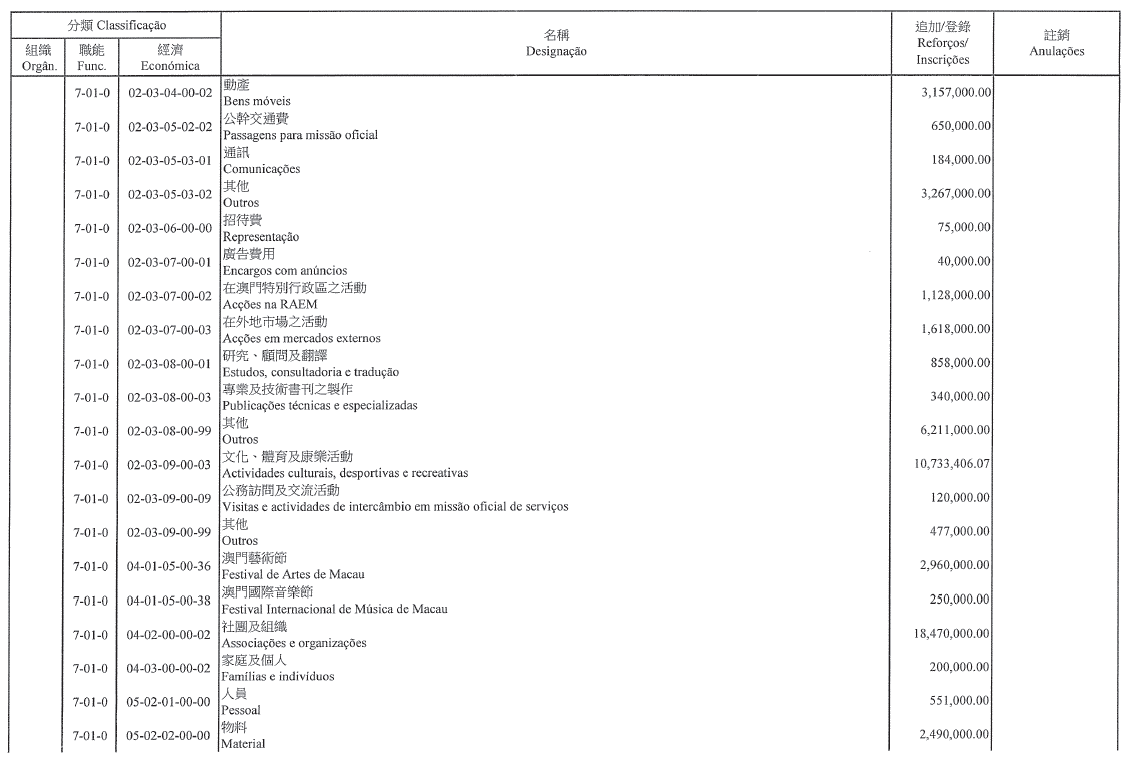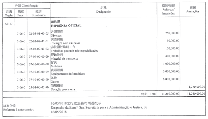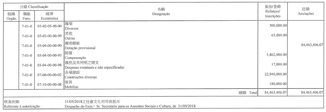根據第2/2018號行政法規第五十二條及第五十三條第五款的規定,茲公佈下列(澳門特別行政區財政預算/二零一八)款項轉移: