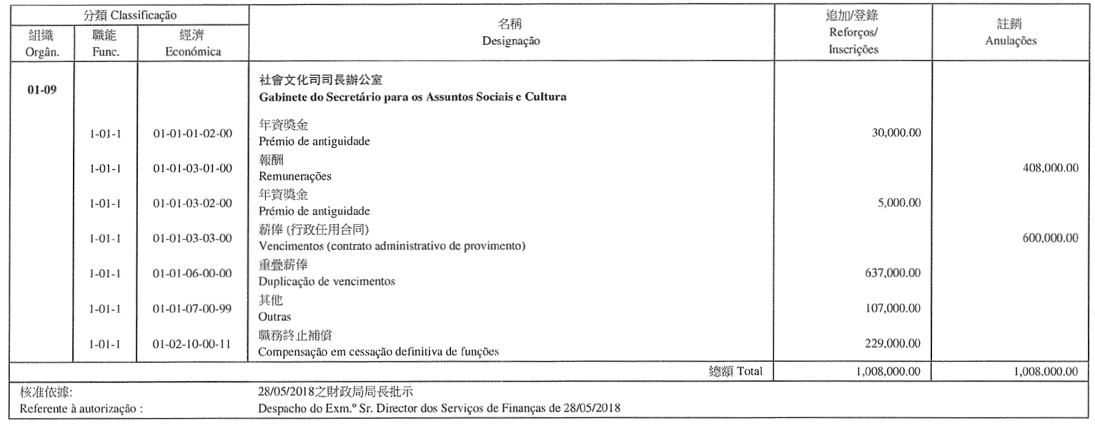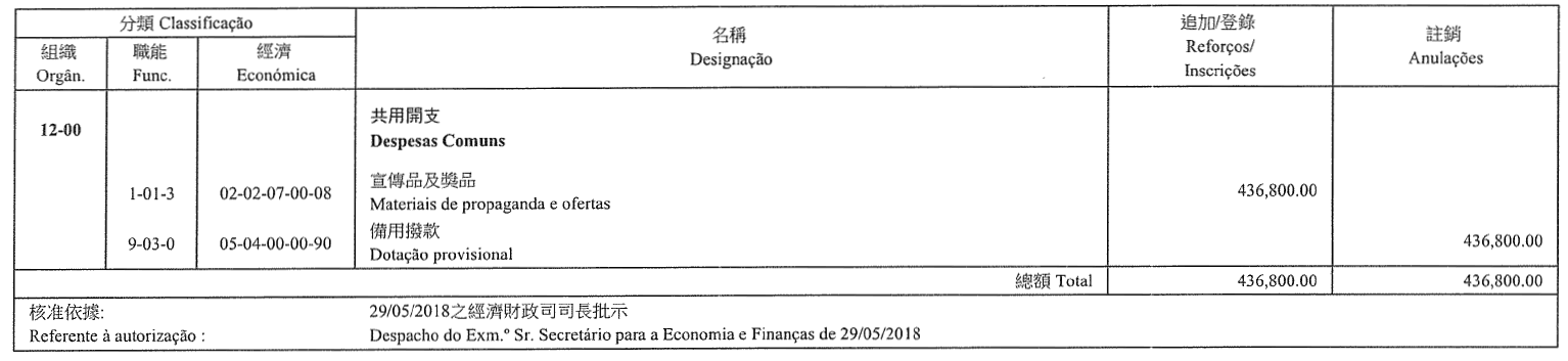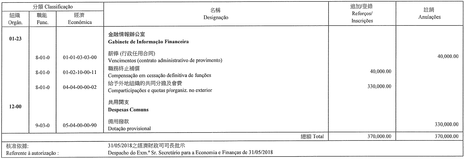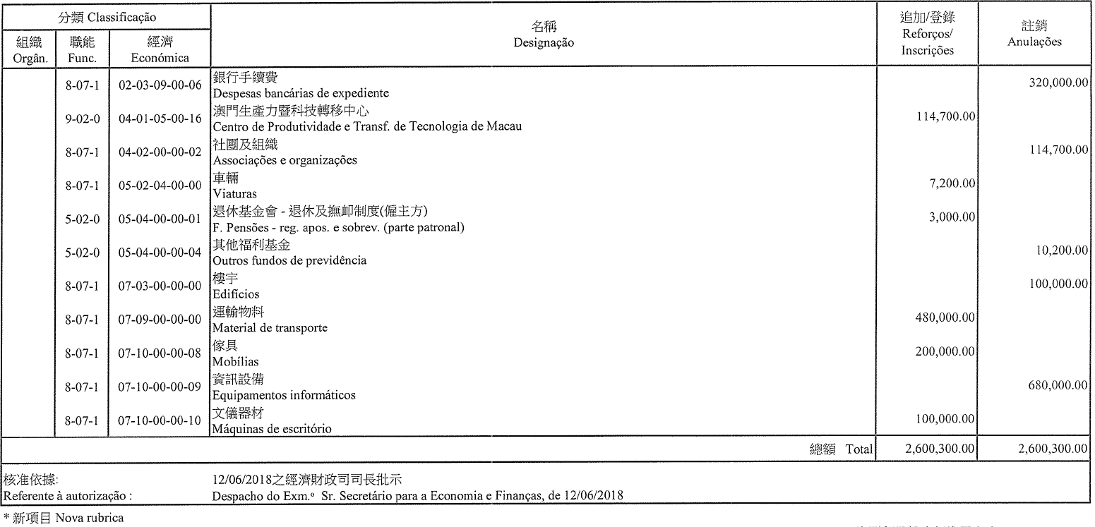 李詠璇——根據現行《行政長官及司長辦公室通則》第十九條第十二款及第12/2015號法律《公共部門勞動合同制度》第四條第二款的規定,以附註形式修改其在行政法務司司長辦公室擔任職務的不具期限的行政任用合同第三條款,晉升至第一職階特級技術員,薪俸點505點,由二零一八年七月九日起生效。