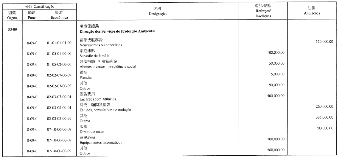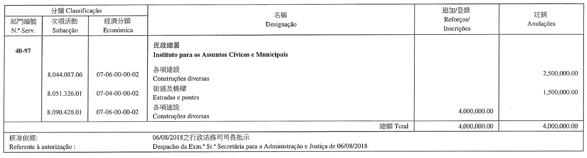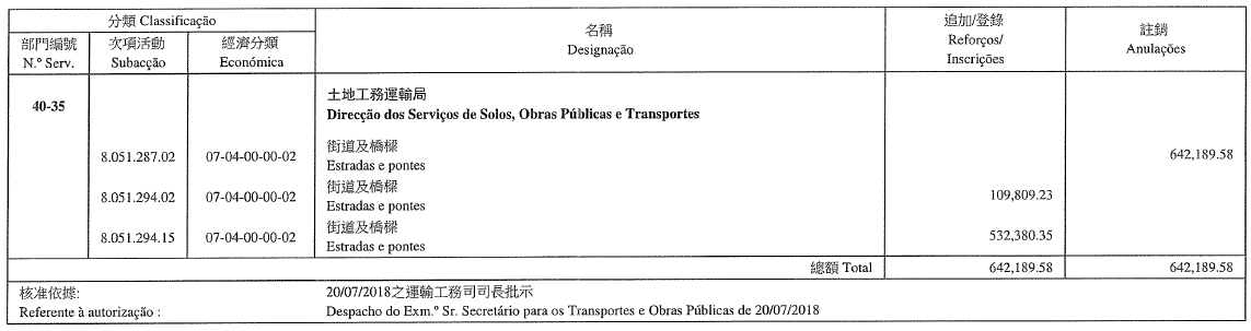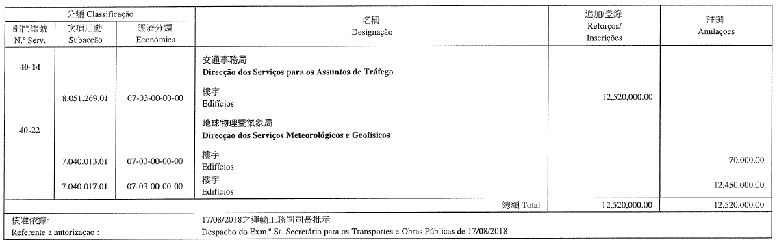 根據第2/2018號行政法規第五十二條及第五十三條的規定,茲公佈下列(行政當局投資與發展開支計劃/二零一八)款項轉帳: