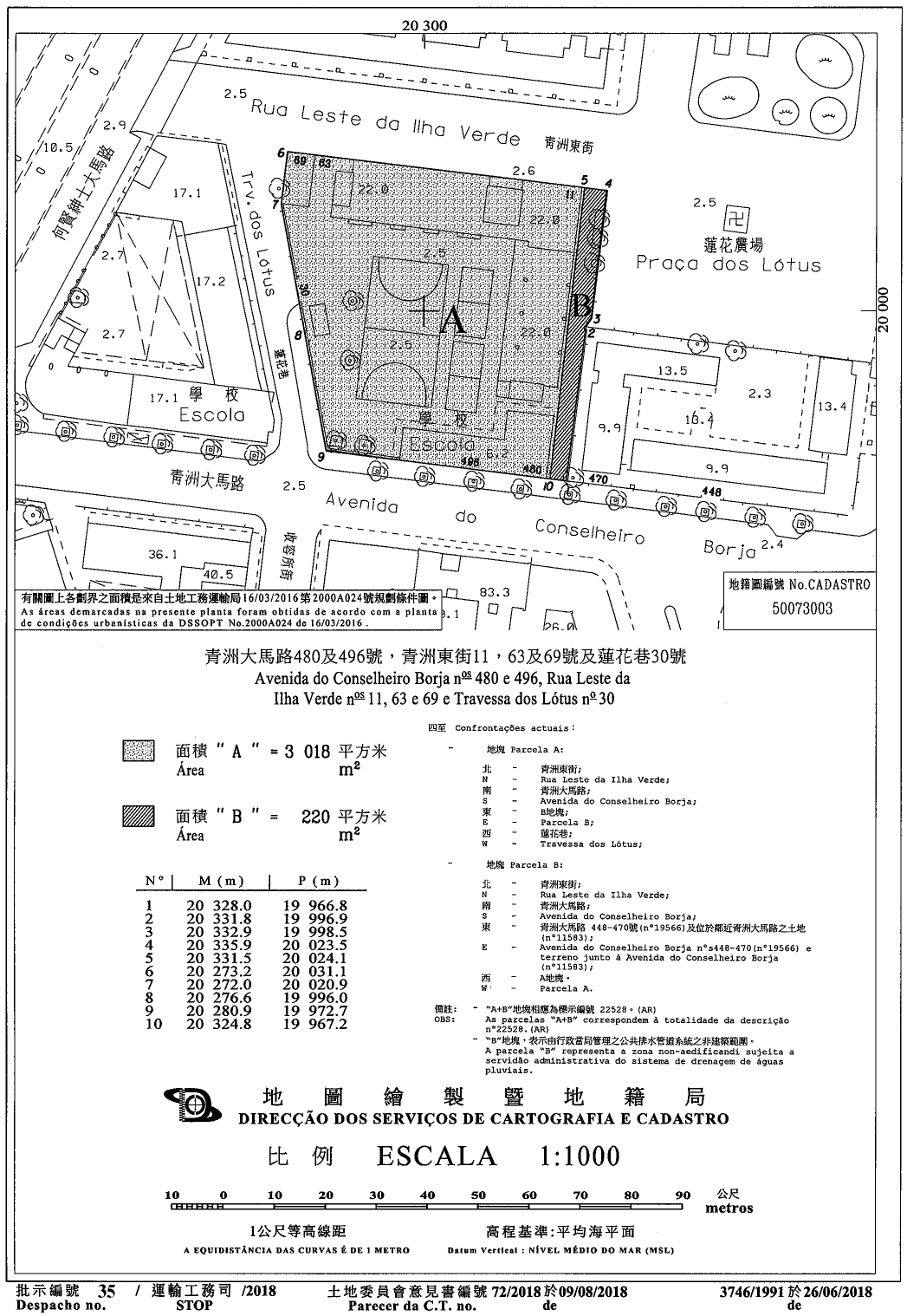1. Constitui objecto do presente contrato a revisão da concessão, por arrendamento, do terreno com a área de 3 238 m2 (três mil, duzentos e trinta e oito metros quadrados), situado na península de Macau, na Avenida do Conselheiro Borja n.os 480 e 496, na Rua Leste da Ilha Verde n.os 11, 63 e 69, e na Travessa dos Lótus n.º 30, titulada pela escritura pública, outorgada na Direcção dos Serviços de Finanças em 2 de Maio de 1985, lavrada a fls.112 e seguintes do livro de notas n.º 245, e revista pelo Despacho n.º 69/GM/93, publicado no Boletim Oficial de Macau n.º 33, II Série, de 18 de Agosto de 1993, e pelo Despacho do Secretário para os Transportes e Obras Públicas n.º 50/2002, publicado no Boletim Oficial da Região Administrativa Especial de Macau n.º 26, II Série, de 26 de Junho de 2002, descrito na CRP sob o n.º 22 528 a fls. 136 do livro B118M e cujo direito resultante da concessão se acha inscrito a favor da segunda outorgante sob o n.º 8 432 do livro F47M, demarcado e assinalado com as letras «A» e «B», na planta n.º 3 746/1991, emitida pela DSCC, em 26 de Junho de 2018;