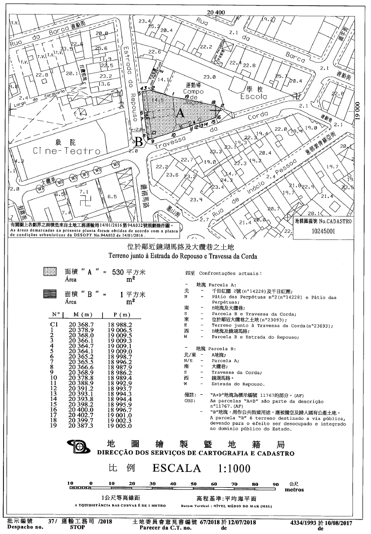 7. O terreno objecto do contrato, com a área de 531 m2, encontra-se demarcado e assinalado com as letras «A» e «B», respectivamente, com a área de 530 m2 e 1 m2, na planta cadastral n.º 4 334/1993, emitida pela Direcção dos Serviços de Cartografia e Cadastro, doravante designada por DSCC, 10 de Agosto de 2017.