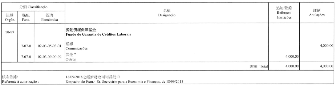 根據第12/2015號法律《公共部門勞動合同制度》第六條第一款之規定,本部門第一職階勤雜人員周霍佩連,編號為170030,薪俸為現行薪俸表之110點,其行政任用合同獲續期一年,自二零一八年九月二十九日起生效。