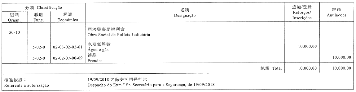 按照保安司司長於二零一八年九月五日作出之批示,批准海關福利會根據《行政程序法典》第一百二十七條廢止刊登於二零一八年七月十八日第二十九期《澳門特別行政區公報》第二組,關於海關福利會二零一八年財政年度第一次預算修改。