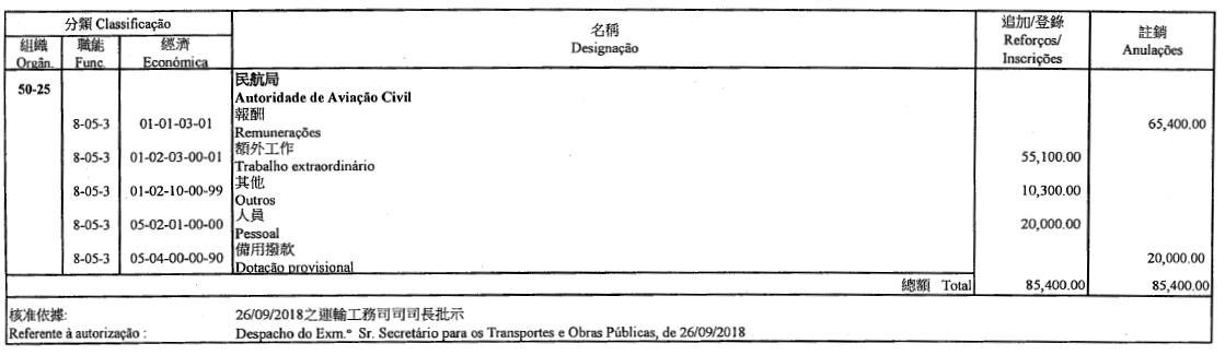 根據經第4/2017號法律修改的第14/2009號法律第十三條第二款(二)項、第四款及第12/2015號法律第四條第二款的規定,以附註形式修改敖卓亭在本局擔任職務的不具期限的行政任用合同第三條款,轉為收取相等於第四職階輕型車輛司機,薪俸點180點,自二零一八年八月二十二日起生效。