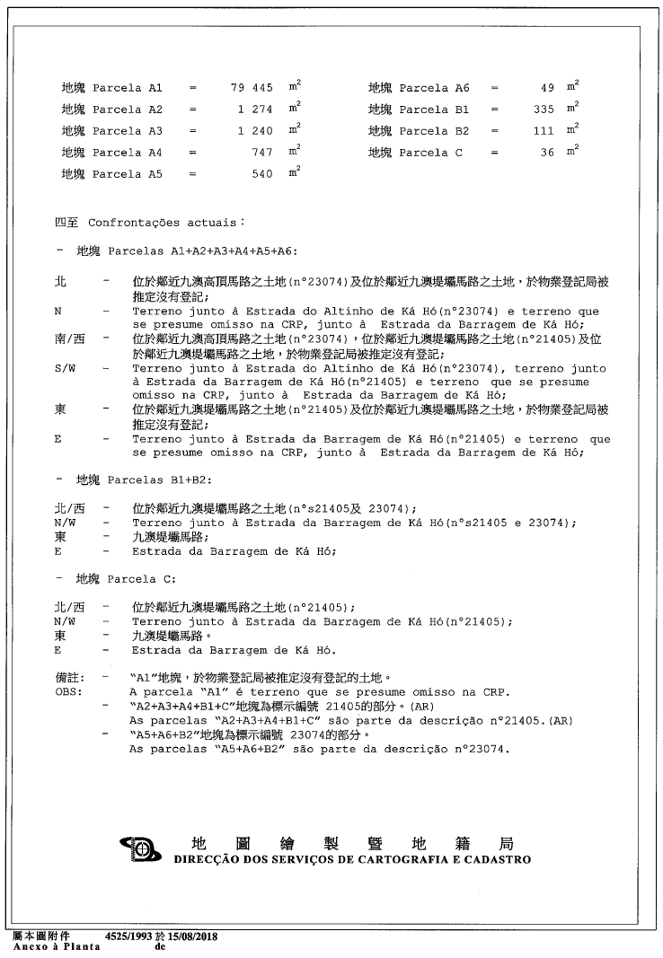 一、海島旅遊發展有限公司宣告放棄五幅以租賃方式批出,面積分別為1,274平方米、1,240平方米、747平方米、335平方米及36平方米,位於路環島,鄰近九澳堤壩馬路,在地圖繪製暨地籍局於二零一八年八月十五日發出的第4525/1993號地籍圖中以字母“A2”、“A3”、“A4”、“B1”及“C”定界及標示,將脫離標示於物業登記局B49冊第119頁背頁第21405號土地的地塊的批給。
