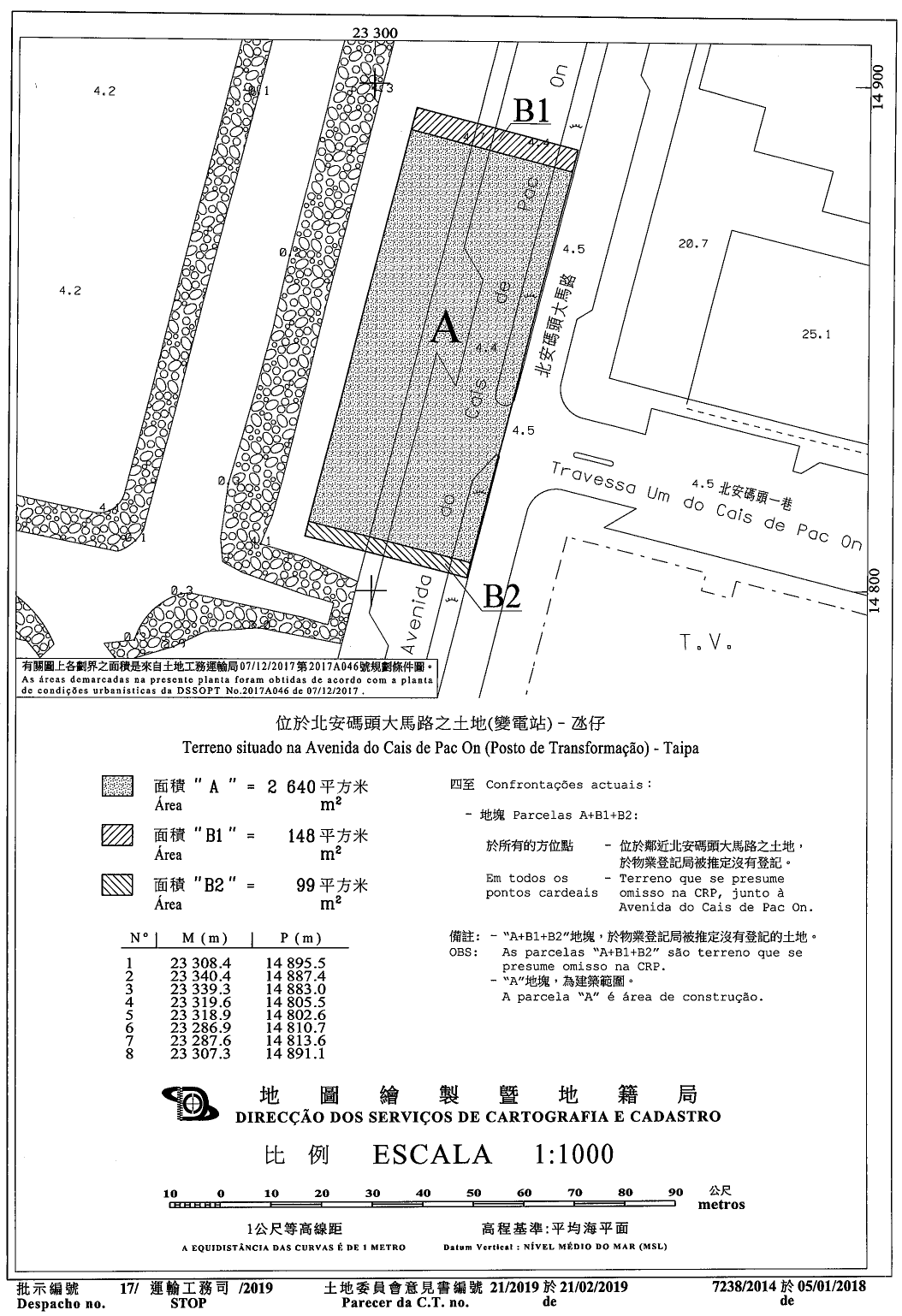 五、合同標的土地的總面積為2,887平方米,在地圖繪製暨地籍局於二零一八年一月五日發出的第7238/2014號地籍圖中以字母“A”、“B1”及“B2”定界及標示,面積分別為2,640平方米、148平方米及99平方米。