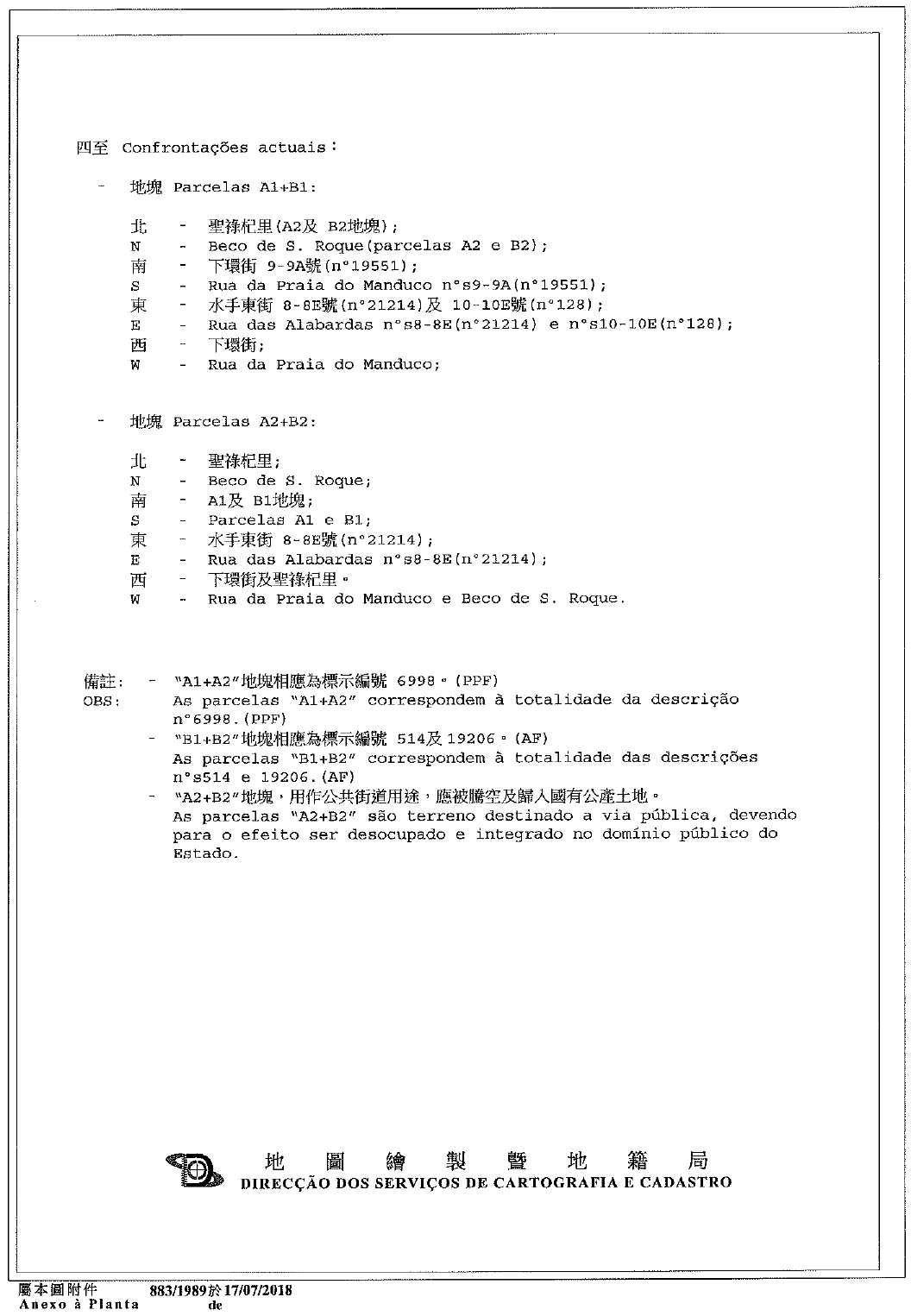 五、該等土地在地圖繪製暨地籍局於二零一八年七月十七日發出的第883/1989號地籍圖中以字母“A1”、“A2”、“B1”及“B2”定界及標示,面積分別為110平方米、18平方米、115平方米及27平方米。