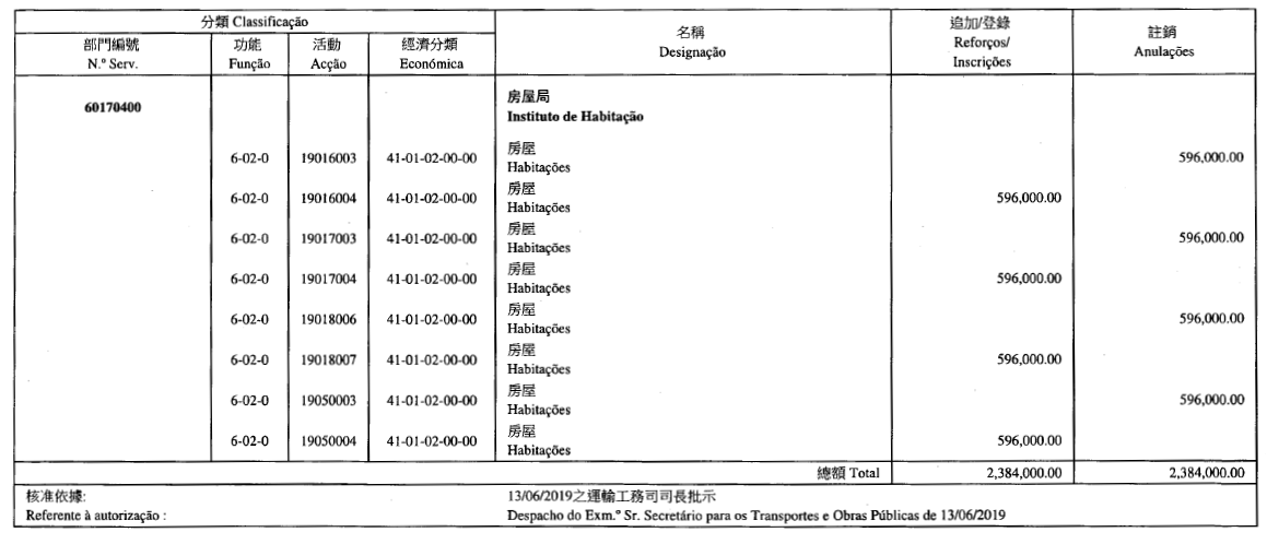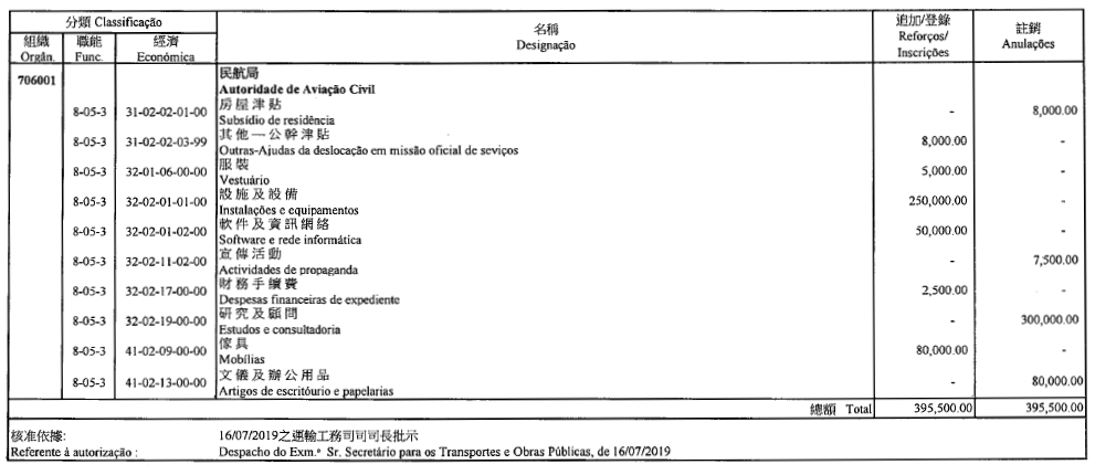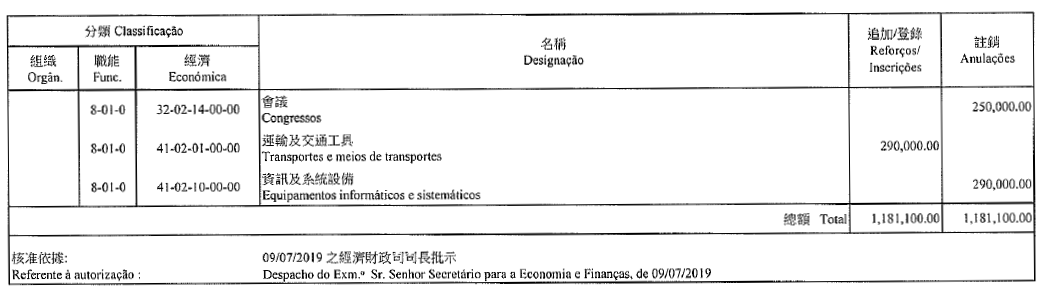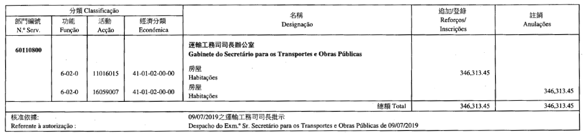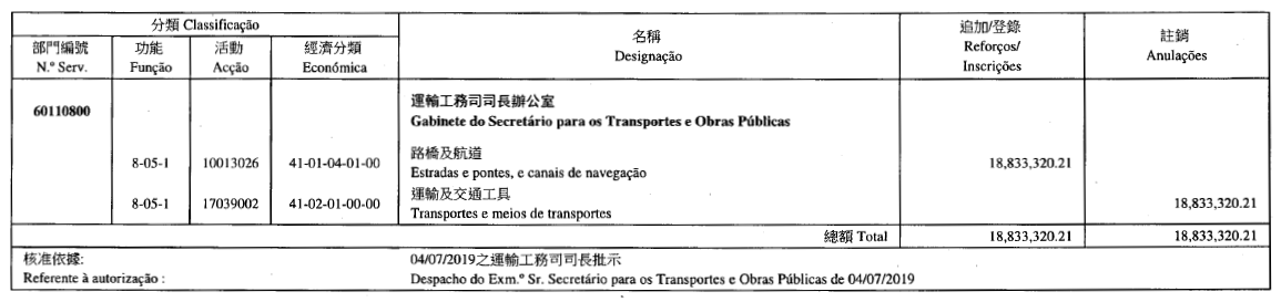Por despacho do Ex.mo Sr. Secretário para os Transportes e Obras Públicas, de 19/07/2019, foram aprovadas, nos termos do artigo 52.º do Regulamento Administrativo n.º 2/2018, as transferências de verbas orçamentais constantes do presente extracto que ora se publica nos termos do artigo 53.º, n.º 5, do mesmo regulamento: