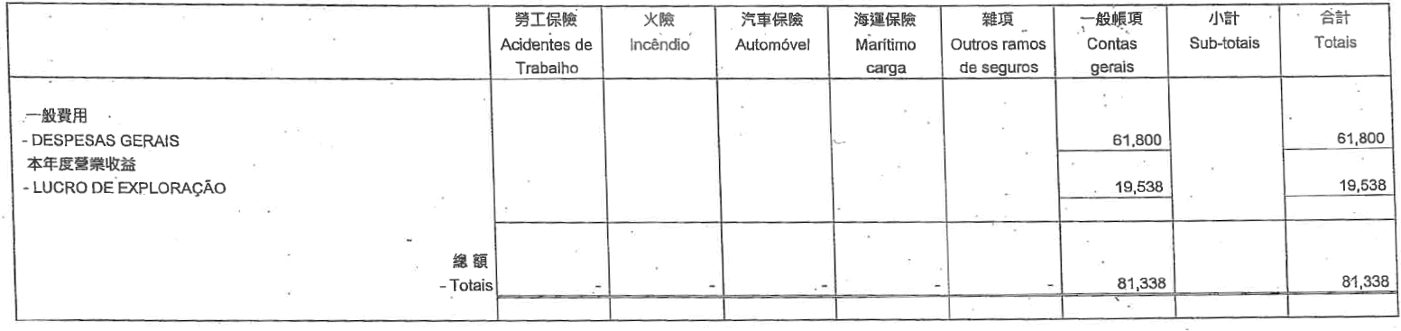 No exercicio de 2018 os prémios brutos processados foram de MOP 33.944.183 (2017: MOP 31.252.334), e as despesas gerais foram de MOP 2.239.911 (2017: MOP 2.410.519). Em 2018, a Sociedade obteve o lucro líquido de MOP 3.194.432 (em 2017: MOP 2.088.240).