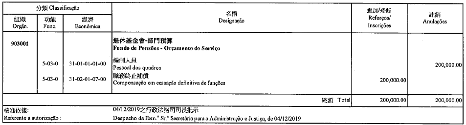 為著有關效力,茲聲明根據第12/2015號法律第九條第一款及第十五條(三)項的規定,本辦公室第三職階首席顧問高級技術員謝永釗自二零一九年十二月二十日調職至社會保障基金日起,其在本辦公室的不具期限的行政任用合同失效。