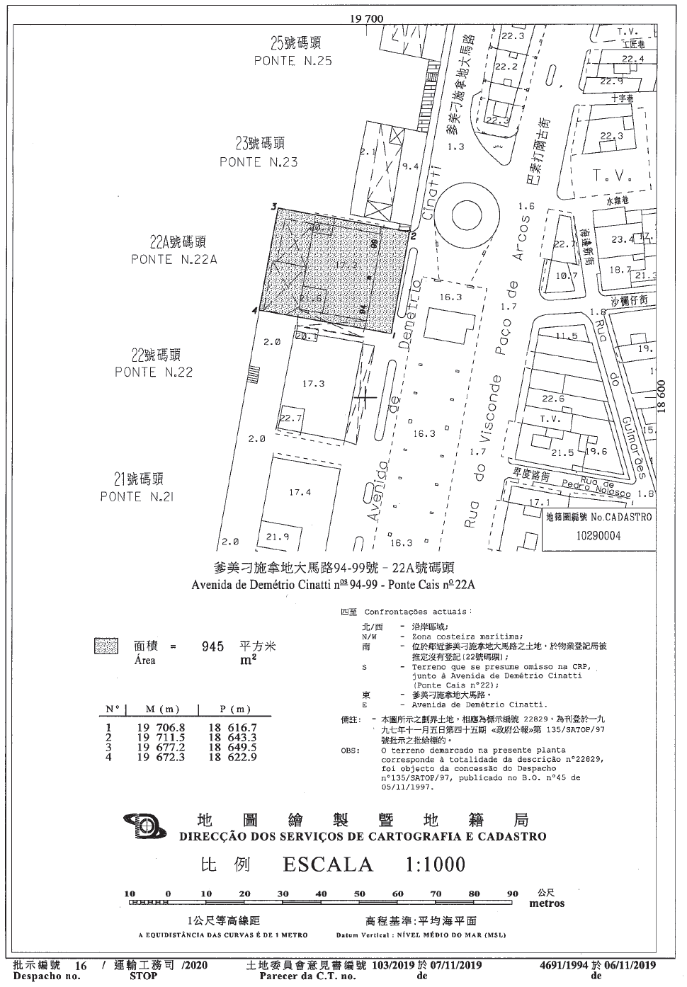 九、有關土地面積為945平方米,在地圖繪製暨地籍局於二零一九年十一月六日發出的第4691/1994號地籍圖中定界。