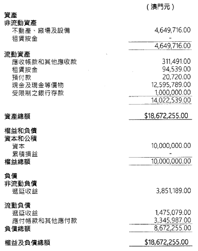 上述已審核的財務報表根據澳門特別行政區政府頒佈的《財務報告準則》要求編制,由二零一九年十二月三十一日之資產負債表及截至該日止年度之損益表、權益變動表和現金流量表組成,亦包括重大會計政策的摘要和其他解釋附註。