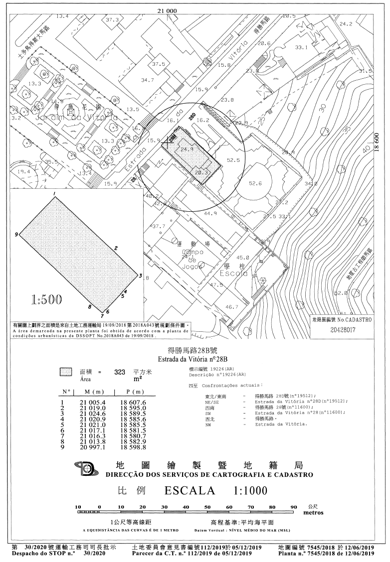 1. 本合同標的為修改一幅以租賃制度批出,登記面積312.2(叁佰壹拾貳點貳)平方米,經重新量度後修正為323(叁佰貳拾叁)平方米,位於澳門半島,其上建有得勝馬路28B號的樓宇,在地圖繪製暨地籍局於二零一九年六月十二日發出的第7545/2018號地籍圖中定界及標示,並標示於物業登記局B39冊第177頁第19226號及其批給所衍生的權利以乙方名義登錄於第355851G號的土地批給。