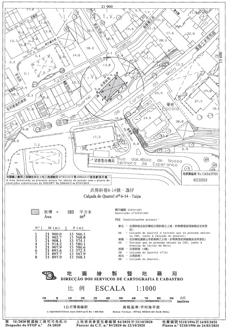 3. O aludido terreno encontra-se demarcado na planta cadastral n.º 5 218/1996, emitida em 24 de Março de 2020, pela Direcção dos Serviços de Cartografia e Cadastro, doravante designada por DSCC.