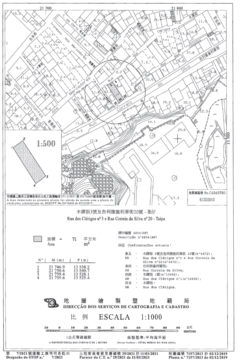 2. O referido terreno, com a área de 71 m2, encontra-se demarcado e assinalado na planta cadastral n.º 7 157/2013, emitida em 2 de Dezembro de 2019, pela Direcção dos Serviços de Cartografia e Cadastro, doravante designada por DSCC.
