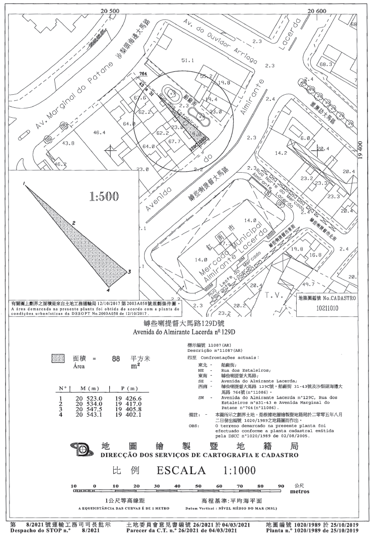 五、合同標的土地經重新量度修正後總面積為88平方米,在地圖繪製暨地籍局於二零一九年十月二十五日發出的第1020/1989號地籍圖中定界及標示。