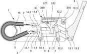 [57] 摘要 : 本發明涉及一種用於樞轉地保持翼板的裝置(1)。該裝置(1)包括平的四連杆機構(4),其包括兩個樞轉式安裝的樞轉臂(6、7)以及以平行地鉸接的方式緊固到該樞轉臂(6、7)的兩個張力臂(8、9),應用於翼板的緊固元件(3)被應用於張力臂(8、9)。本發明還包括用於對樞轉運動進行阻尼的彈性構件(5),其與四連杆機構(4)接合,並且包括用於在兩個端部位置的區域內對樞轉運動進行阻尼的阻尼器裝置(30),其具有線性壓力阻尼器(340)以及第一和第二傳遞元件(320、330)。該壓力阻尼器(340)在兩個端部位置中的第一端部位置的區域內經由該第一傳遞元件(320)而在壓力阻尼器(340)的第一側與兩個樞轉臂中的第一樞轉臂(6)相互作用。此外,該壓力阻尼器(340)在兩個端部位置中的第二端部位置的區域內經由第二傳遞元件(330)而在壓力阻尼器(340)的第二側與兩個樞轉臂中的第二樞轉臂(7)相互作用。本發明還涉及一種應用在裝置(1)中的阻尼器裝置(30)。