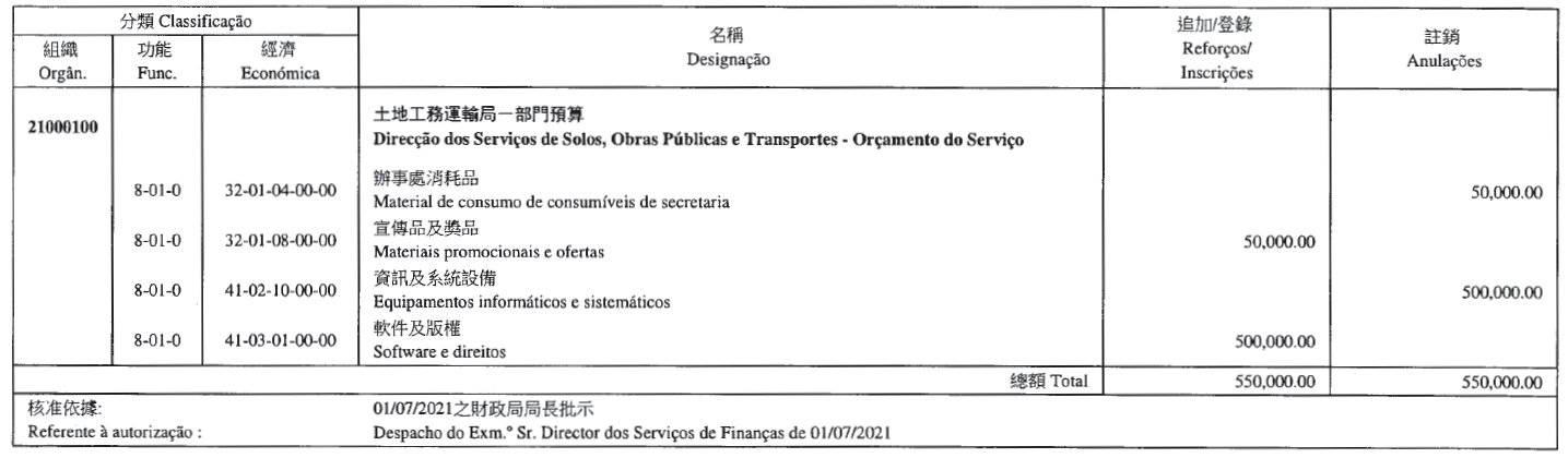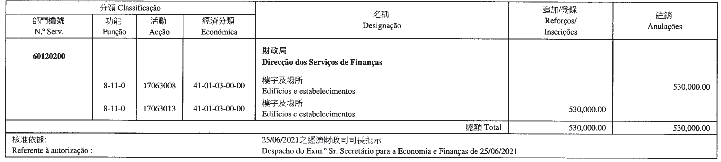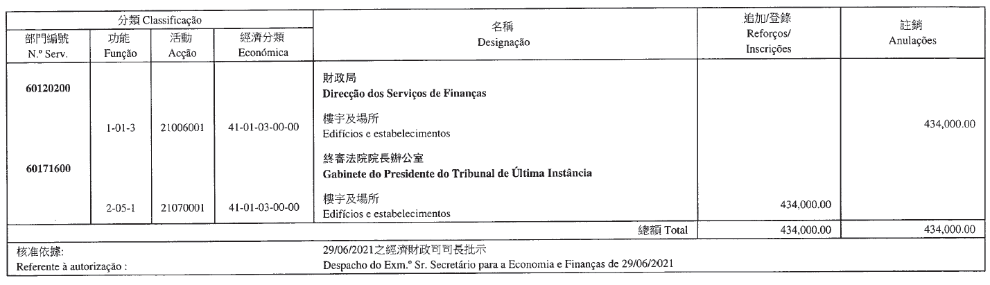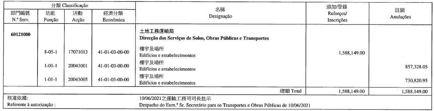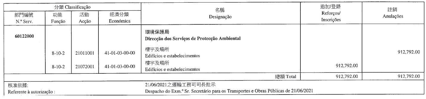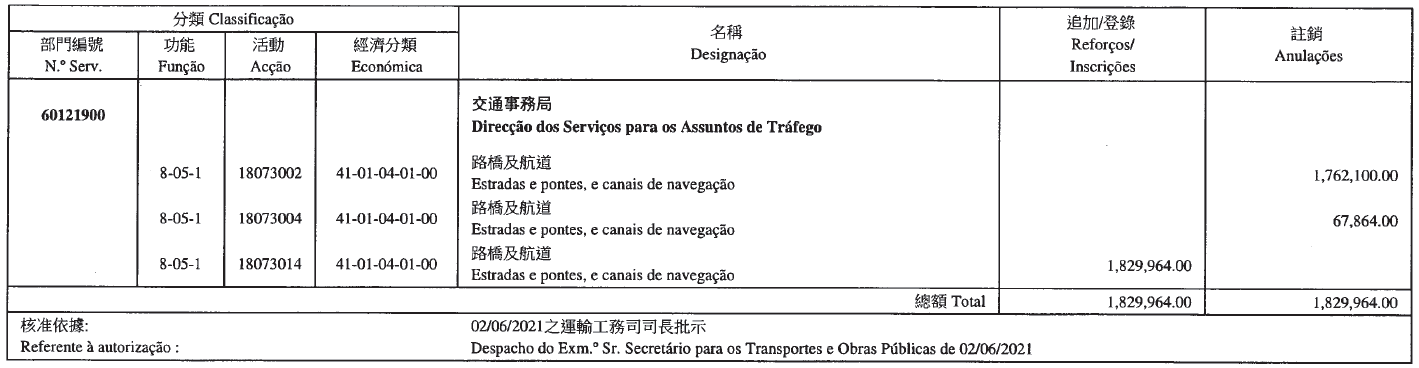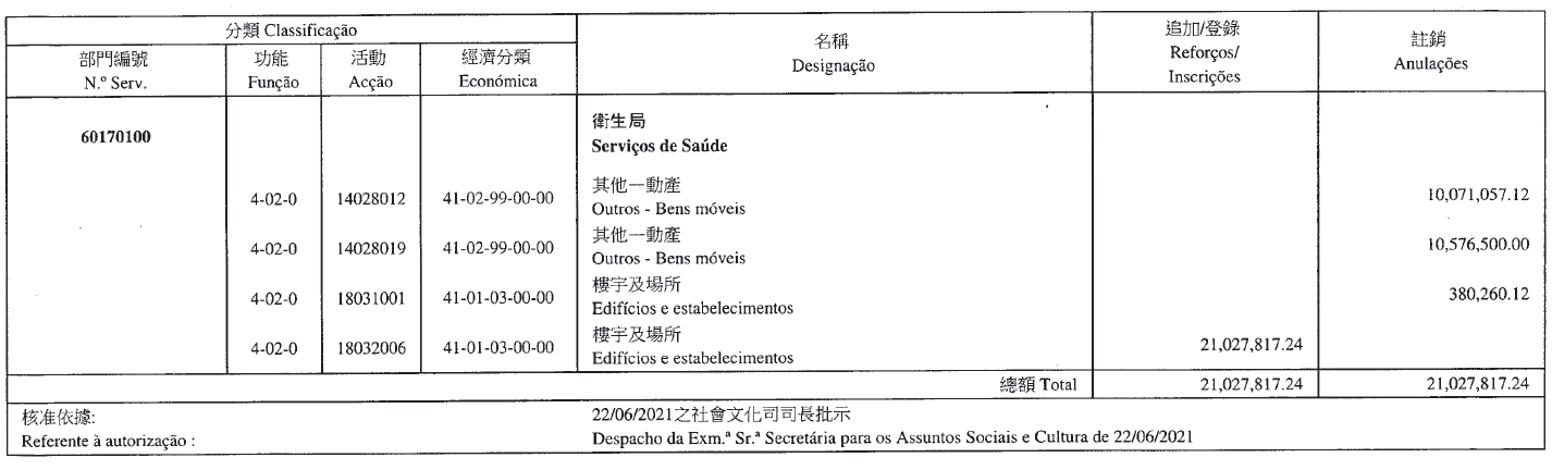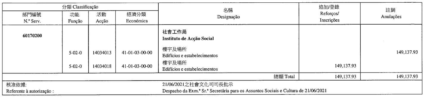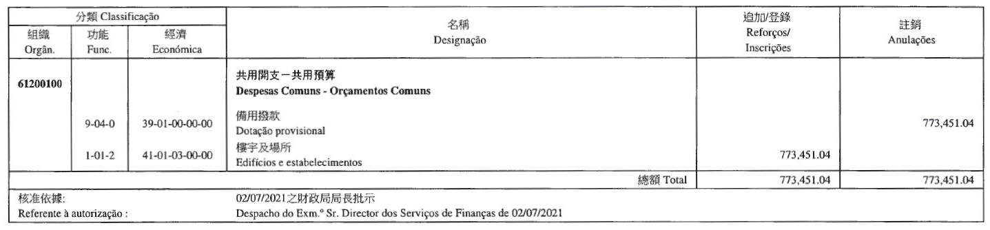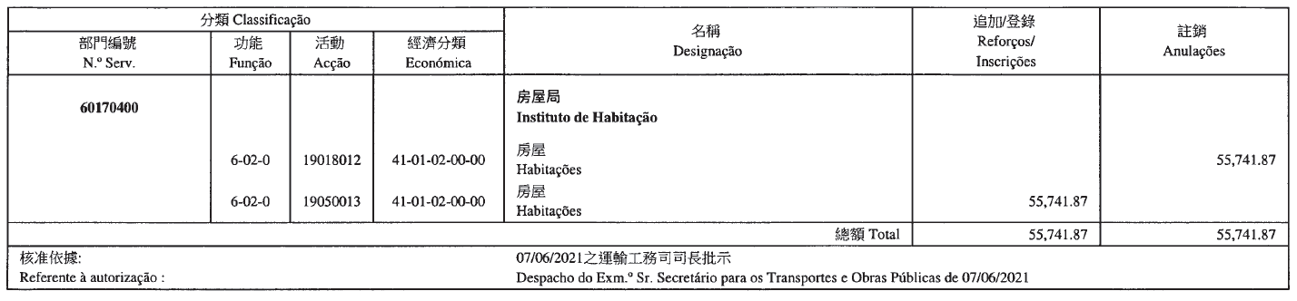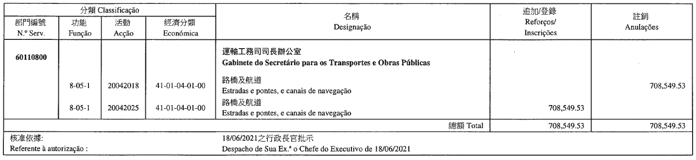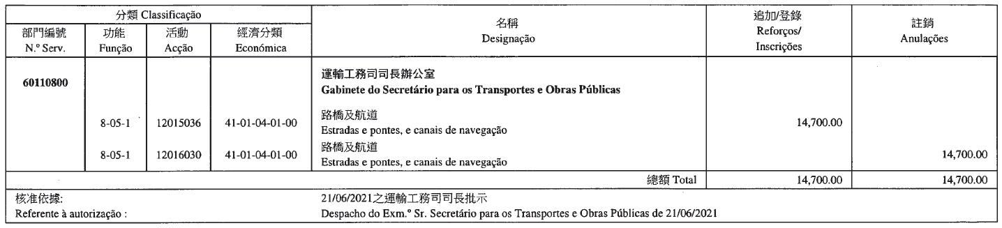 根據第2/2018號行政法規第五十二條及第五十三條第五款的規定,茲公佈下列(澳門特別行政區財政預算/二零二一)款項轉移: