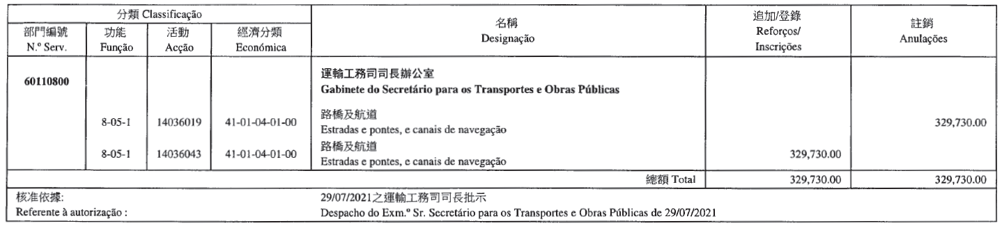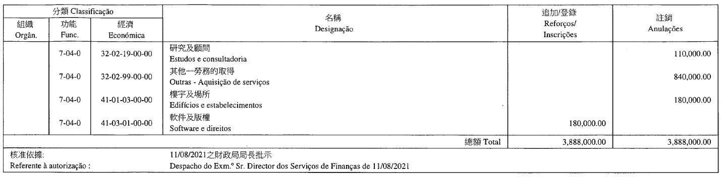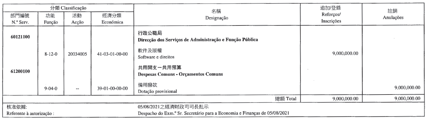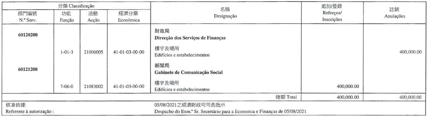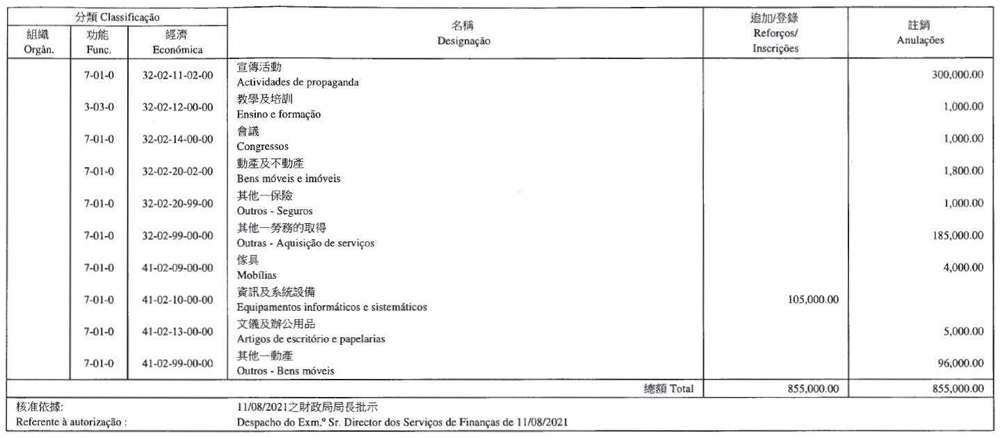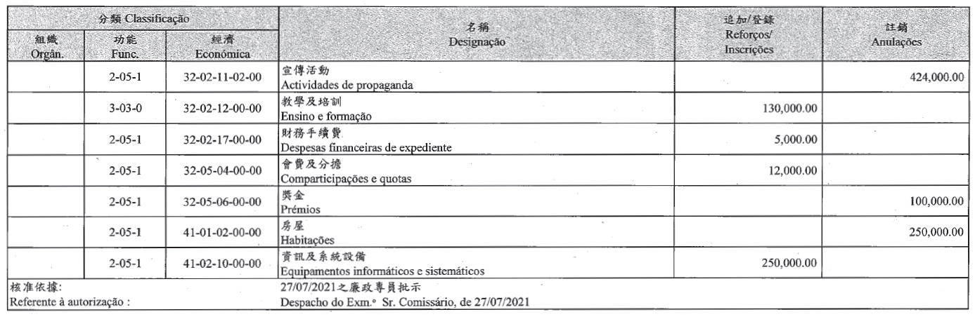 根據第2/2018號行政法規第五十二條及第五十三條第五款的規定,茲公佈下列(澳門特別行政區財政預算/二零二一)款項轉移: