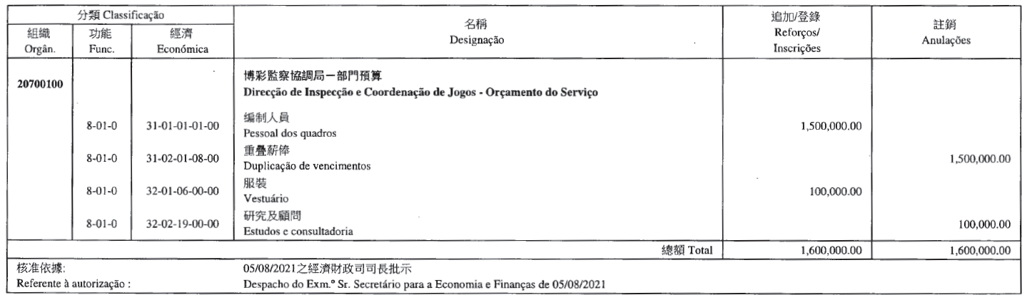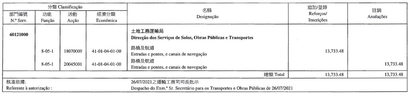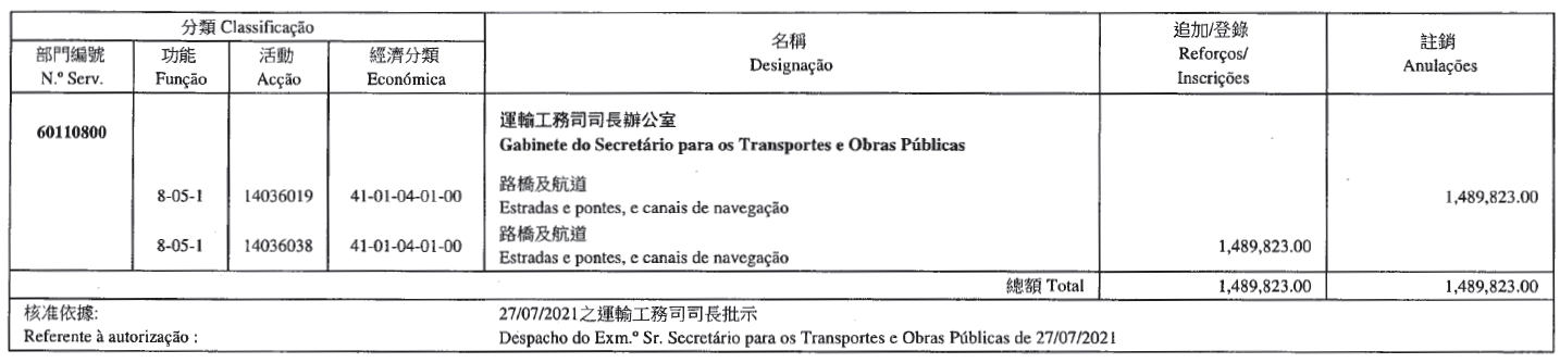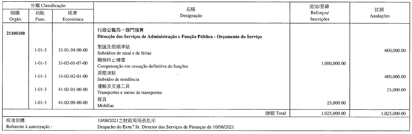 根據第14/2009號法律第十三條第一款(二)項、第四款,以及第12/2015號法律第四條的規定,以附註方式修改林家輝及郭嘉儀在本局擔任職務的不具期限的行政任用合同第三條款,轉為收取相等於第三職階特級地形測量員職級的薪俸點450點,自二零二一年七月二十七日起生效。