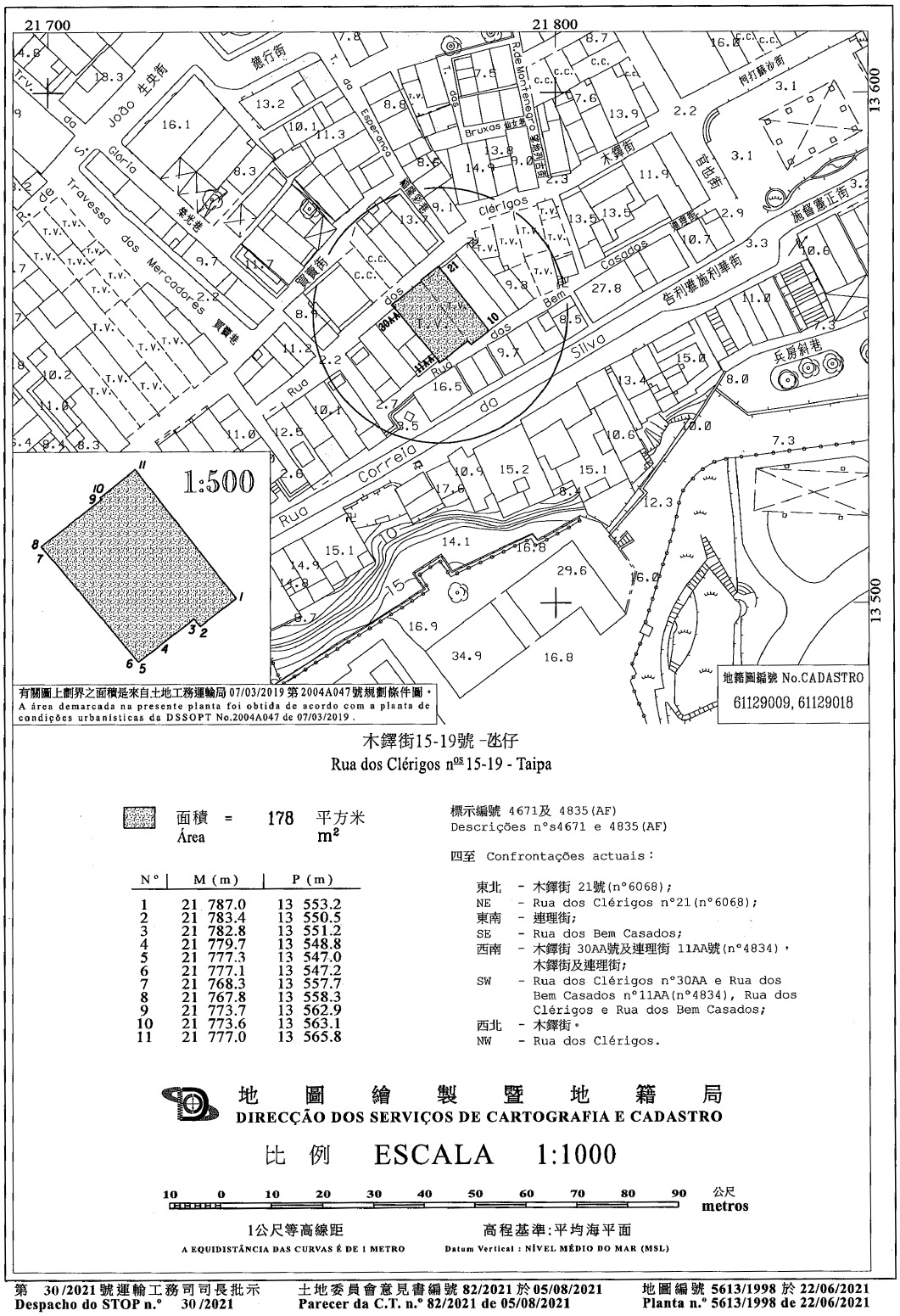 6. O terreno objecto do contrato, com a área global rectificada de 178 m2, encontra-se demarcado e assinalado na planta cadastral n.º 5 613/1998, emitida em 22 de Junho de 2021, pela Direcção dos Serviços de Cartografia e Cadastro, doravante designada por DSCC.