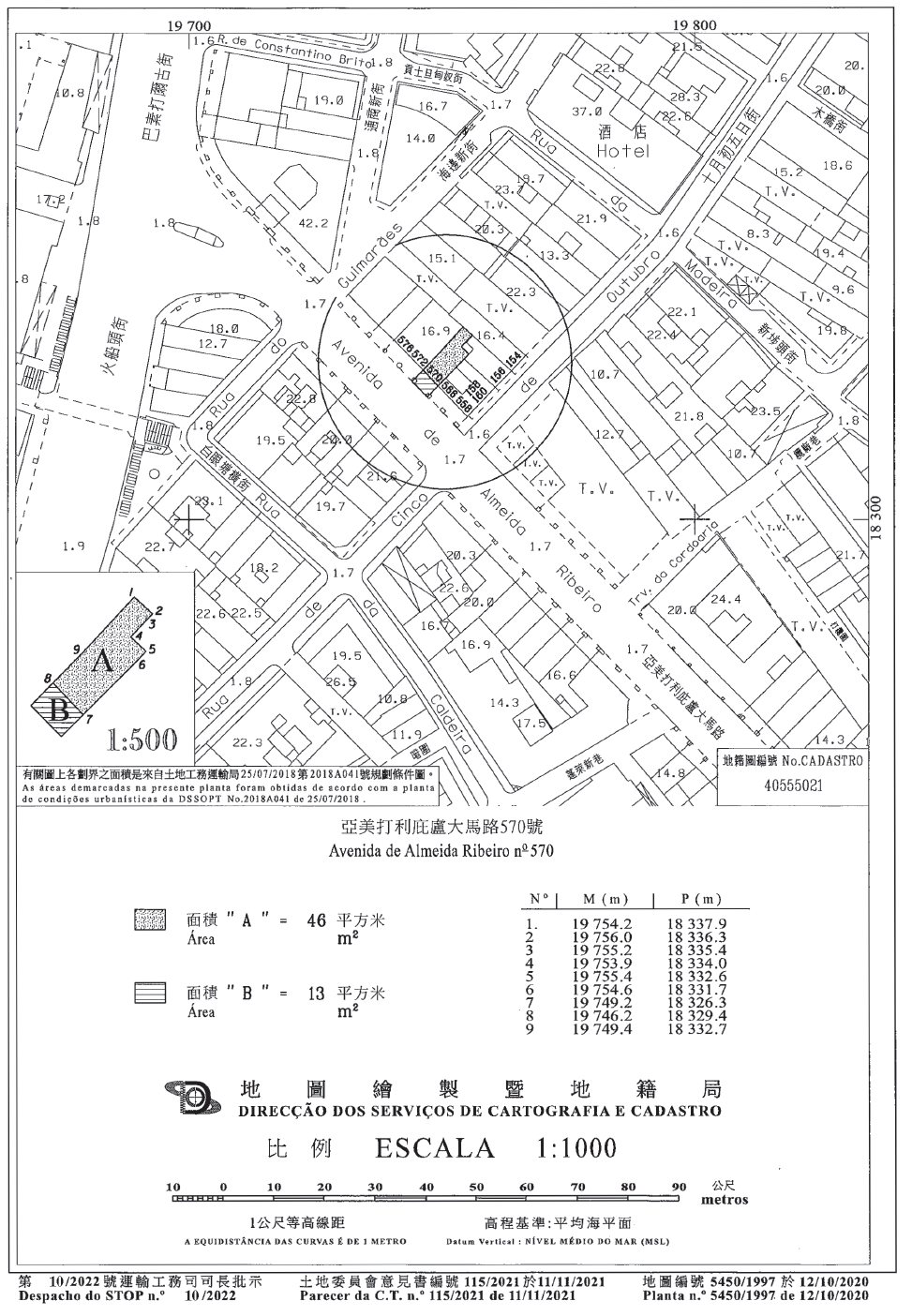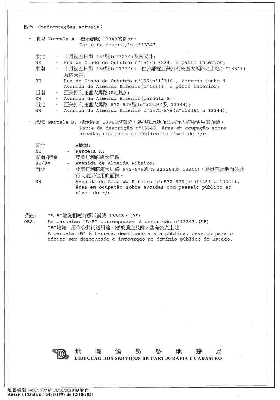 6. O terreno objecto do contrato, com a área de 59 m2, encontra-se demarcado e assinalado com as letras «A» e «B», respectivamente, com as áreas de 46 m2 e 13 m2, na planta cadastral n.º 5 450/1997, emitida em 12 de Outubro de 2020, pela Direcção dos Serviços de Cartografia e Cadastro, doravante designada por DSCC.