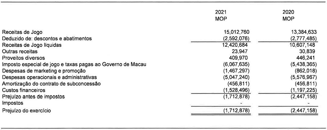 A Galaxy Casino, S.A. e as suas subsidiárias (“GCSA”) contabilizaram uma receita líquida de MOP17,2 mil milhões de patacas, um aumento de 65% em relação ao ano anterior. O resultado líquido do exercício demonstra lucros de MOP1,6 mil milhões de patacas, em comparação com as perdas de MOP3.8 mil milhões em 2020.