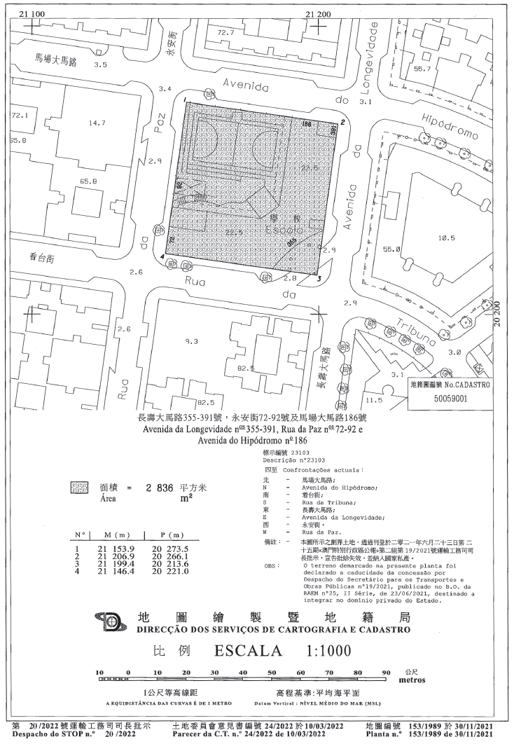 四、本批給標的土地的面積為2,836平方米,標示於物業登記局B冊第23103號,在地圖繪製暨地籍局於二零二一年十一月三十日發出的第153/1989號地籍圖中定界及標示。