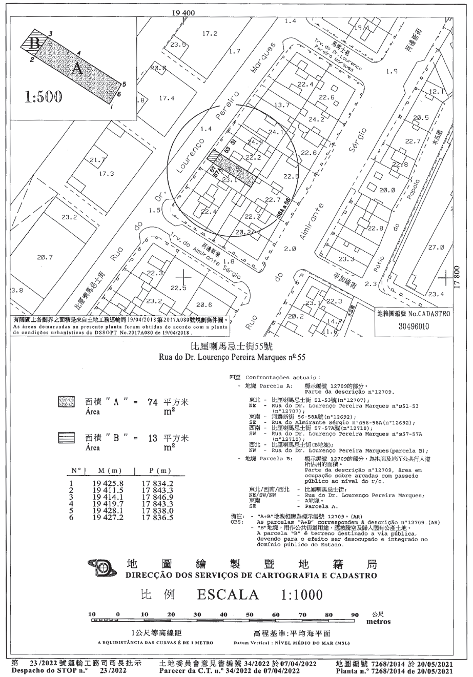 1)修改一幅以租賃方式批出,面積87(捌拾柒)平方米,位於澳門半島,其上曾建有比厘喇馬忌士街55號樓宇,在地圖繪製暨地籍局於二零二一年五月二十日發出的第7268/2014號地籍圖中以字母“A”及“B”定界及標示,並標示於物業登記局B34冊第56頁背頁第12709號及其批給所衍生的權利以乙方名義登錄於第332332G號的土地的批給;