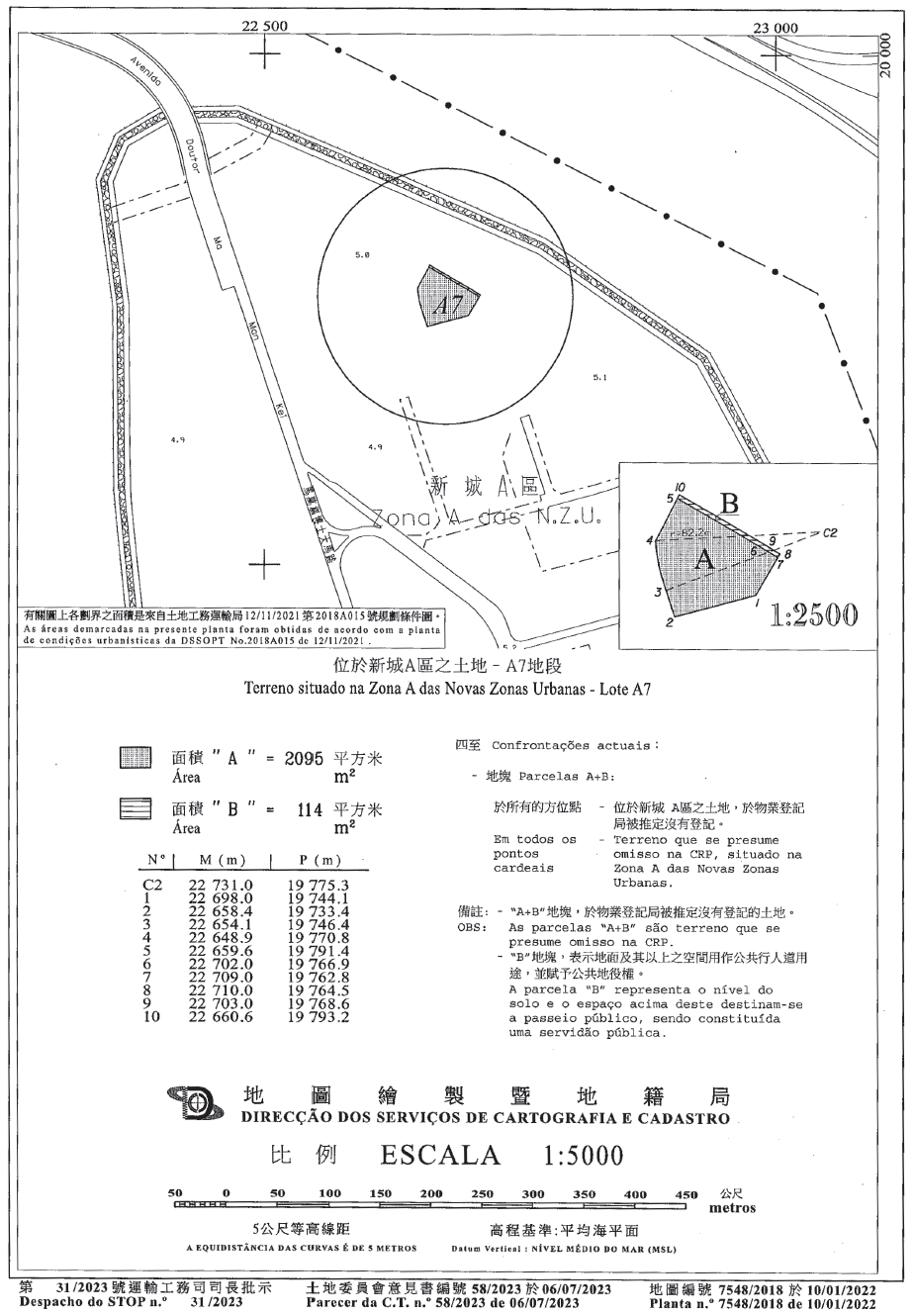 本合同標的為以專用批給制度及豁免公開招標方式批給乙方一幅面積為2,209(貳仟貳佰零玖)平方米,位於新城A區,稱為A7地段,未在物業登記局標示,在本合同組成部分的地圖繪製暨地籍局於二零二二年一月十日發出的第7548/2018號地籍圖中以字母 “A” 及 “B” 定界及標示的公產土地,以下簡稱土地。