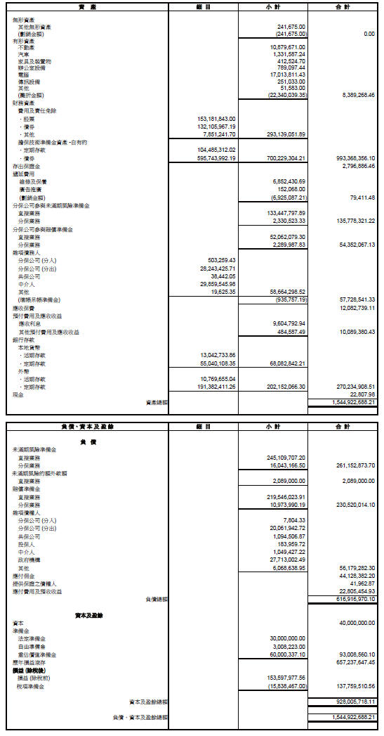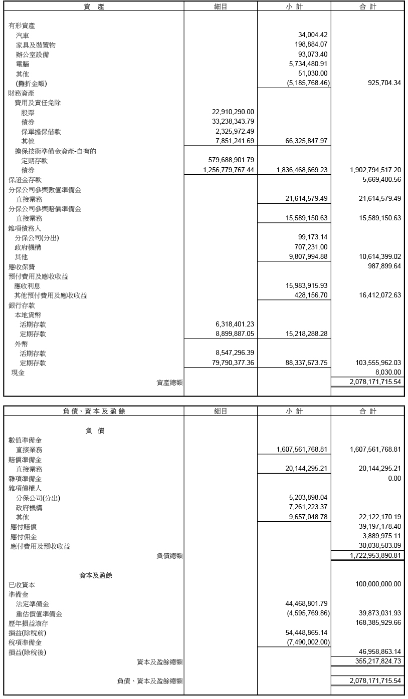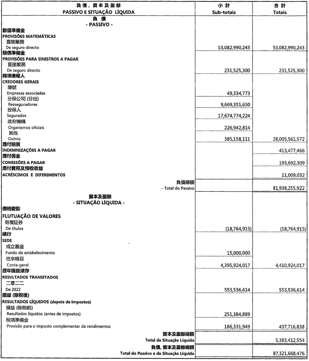 A 31/12/2023 as provisões técnicas da seguradora cifravam-se em 212,2 milhões de patacas, das quais cerca de 45% respeitavam a provisões para sinistros.