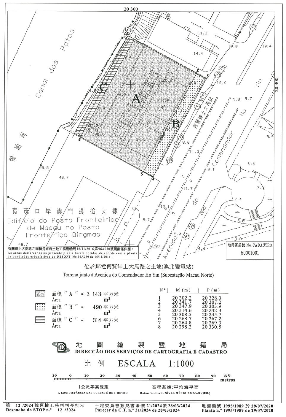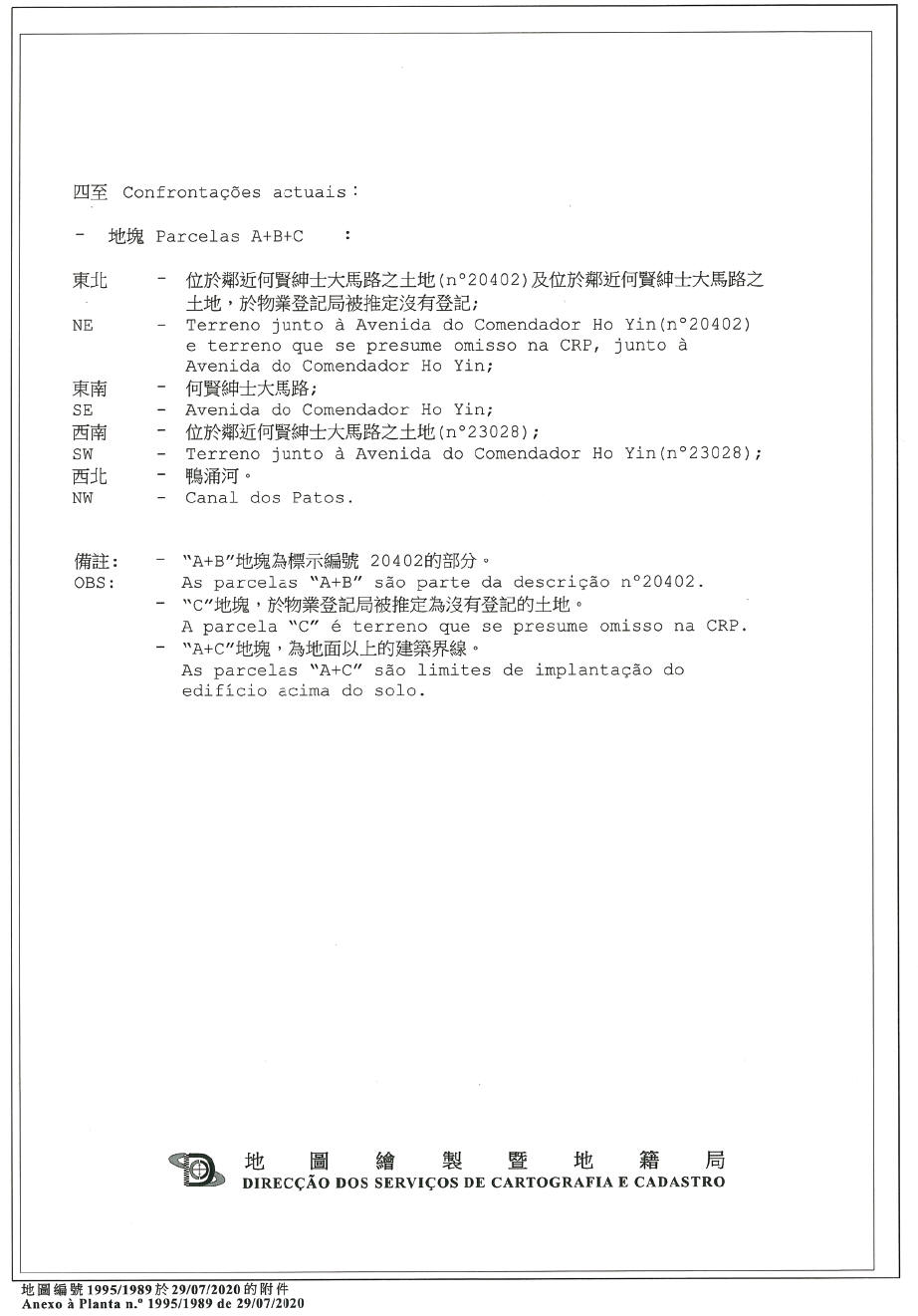 5. O terreno objecto do contrato, com a área global de 3 947 m2, encontra-se demarcado e assinalado com as letras “A”, “B” e “C”, respectivamente com as áreas de 3 143 m2, 490 m2 e 314 m2, na planta n.º 1995/1989, emitida pela Direcção dos Serviços de Cartografia e Cadastro, doravante designada por DSCC, em 29 de Julho de 2020.