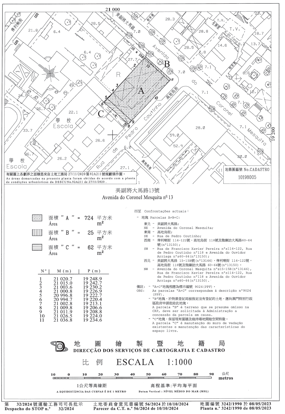 六、該幅屬完全所有權制度的土地在地圖繪製暨地籍局於二零二三年五月八日發出的第3242/1990號地籍圖中以字母“A”及“C”定界及標示,面積分別為724平方米及62平方米,而該幅國有可處置的土地的面積為25平方米,在上述地籍圖中以字母“B”定界及標示。